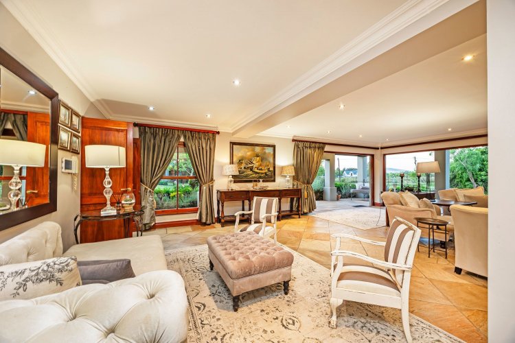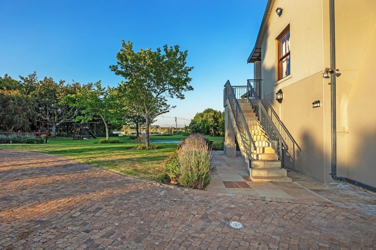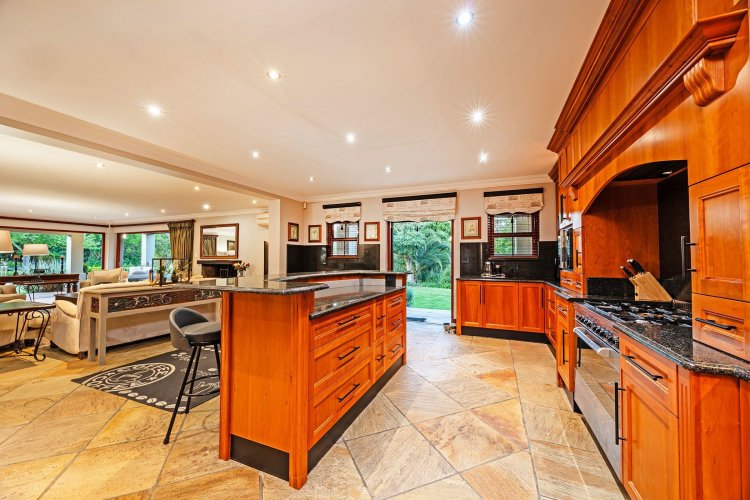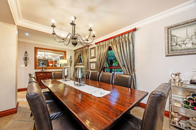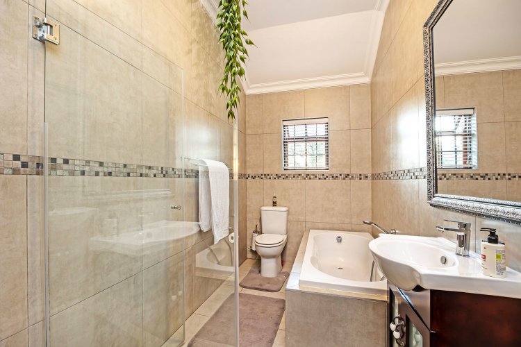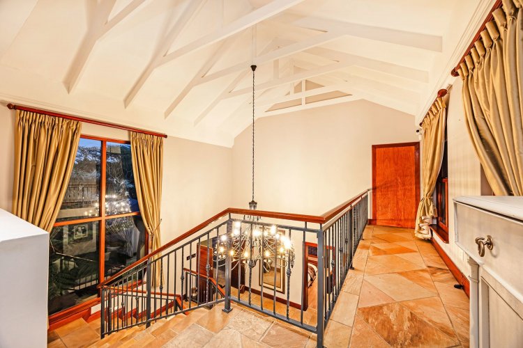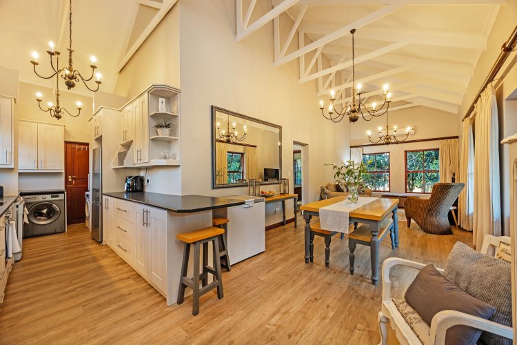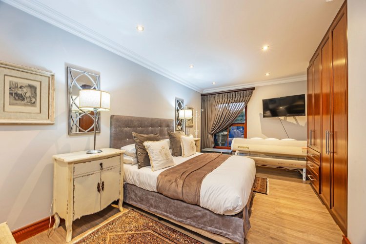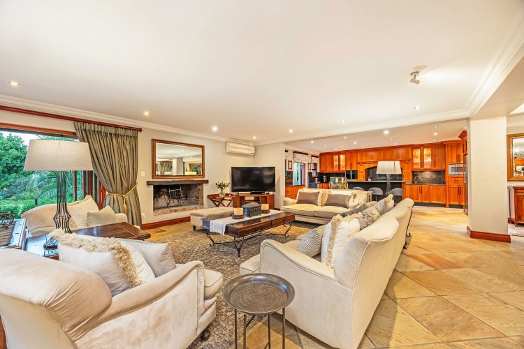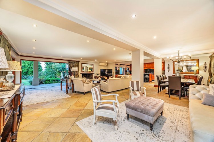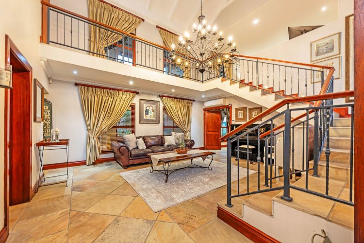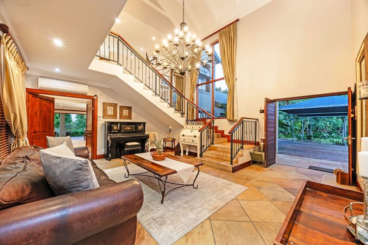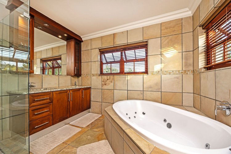 Bathed in natural light, this generously proportioned home offers a double volume entrance hall, three open plan living areas with contemporary indoor braai/fireplace and stunning gourmet solid cherry wood kitchen with Rustenburg granite tops – all opening seamlessly onto the landscaped well-maintained garden and covered patio. A private guest suite also to be found on the ground floor adjacent to an eye-catching staircase that leads up to a spacious pajama lounge with double door leading to a wraparound large patio and overlooking this stunning garden with views on the Vierlanden dam and mountains. The master suite is luxurious with a coffee station, full en-suite with spa bath and double basin. Also opening up to the covered patio overlooking the lovely garden and dam. There is another double bedroom on this level, sharing a bathroom. Reflecting a style that is both functional and sophisticated this home has its own security cameras, alarm, beams and day/night outside lights. Other notable extras include the highest quality fixtures and fittings throughout, bespoke cabinetry, high ceilings, vinyl flooring, sand stone tiles, ceiling fans, heated towel rails, borehole, water tank, irrigation, air cons, fibre swimming pool and under covered parking for 4 vehicles. Besides the stunning main house, there is a second dwelling with 2 bedrooms, lovely open plan living area with exposed beams opening up to large covered patio overlooking the luscious garden. Th 2nd dwelling has its own carport. Perfect to work from home or for a granny. The ultimate bonus is the three self-contained flatlets with each with their own bathroom and kitchen, as well as pre-paid electricity meters and alarms. This lovely property does not only offer tranquilness, but also an income generation business of just shy of close to R40 000 per month. However, to convert the flatlets back to the main house is easily possible. A must to view this once in a life time opportunity, close to all amenities, schools, hospital and trails.