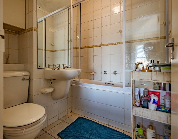 The generously sized main bedroom includes built-in wardrobes and an en-suite bathroom with a shower-over-bath configuration.