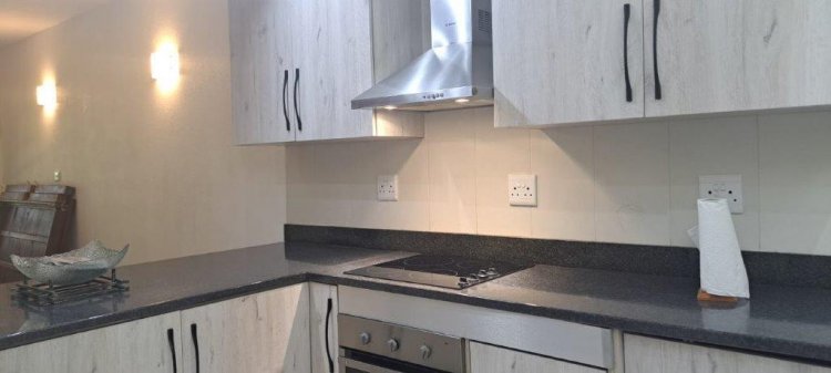 A ground floor two bed unit, fitted with porcelain tiles throughout. The open plan living area encompasses a kitchen with beautifully appointed cabinets, hob, electric oven, granite tops and extractor fan. The living area opens onto a spacious verandah with lawns and shaded indigenous trees and glimpses of the gorge. Double wooden French wooden doors open onto the verandah from the living area.