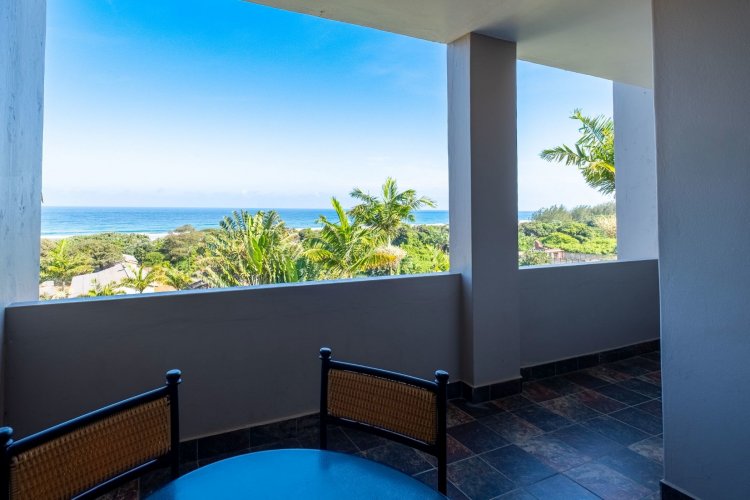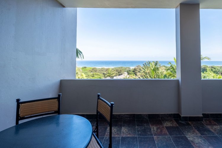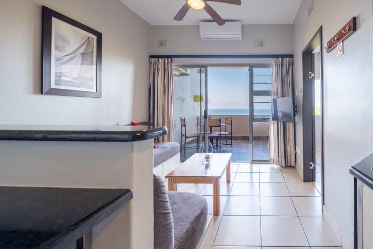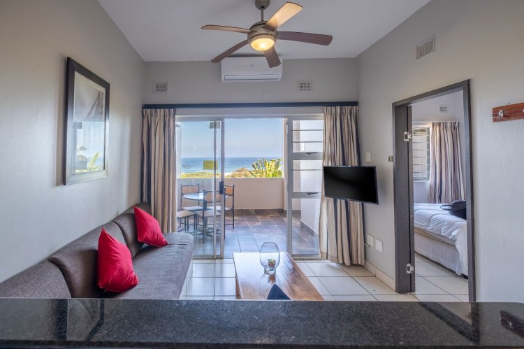 The living area opens through sliding doors to an undercover balcony that showcases a beautiful ocean view. It is an ideal spot to unwind, enjoy quiet mornings or spend time with friends while taking in the scenery.