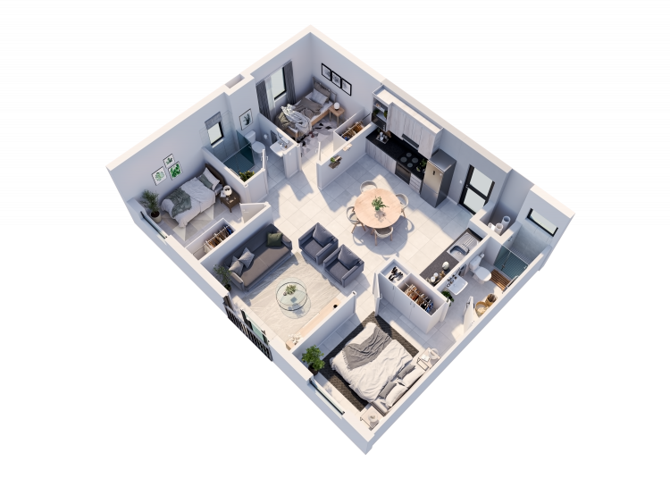 Each apartment boasts a well-equipped kitchen, a cozy lounge area, and a stylish bathroom, creating an ideal environment for relaxation and entertaining. Expansive windows flood the space with natural light, ensuring a bright and airy atmosphere throughout.