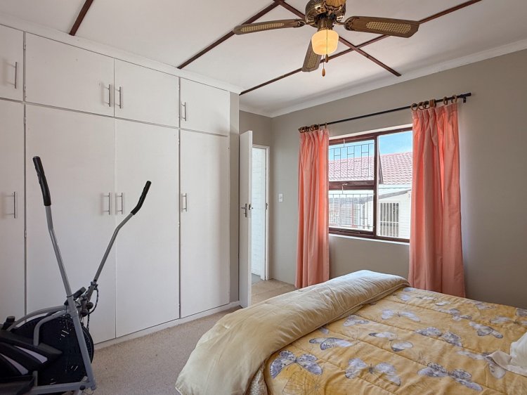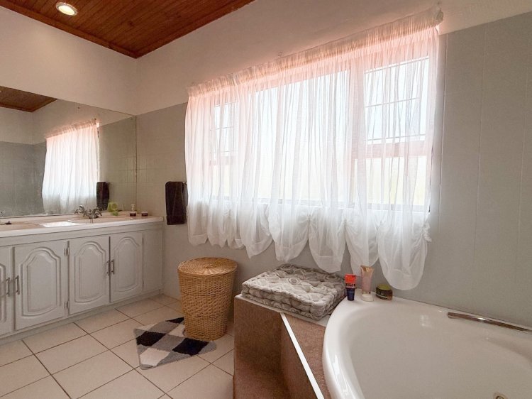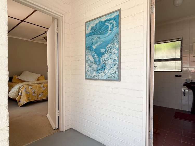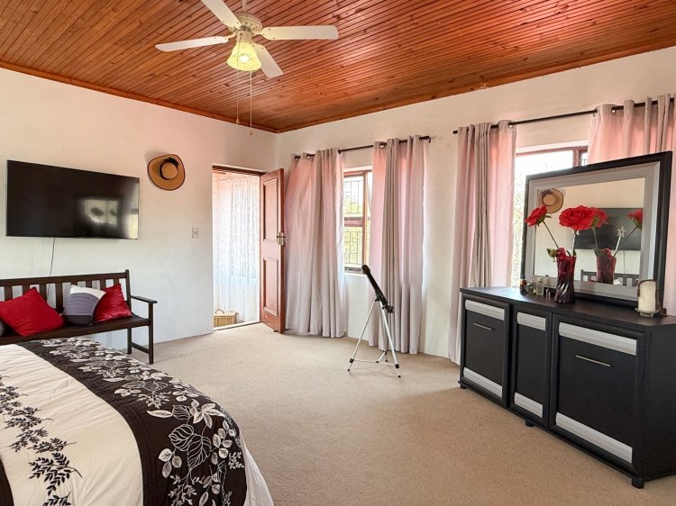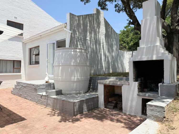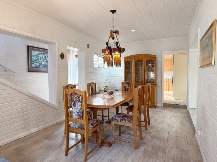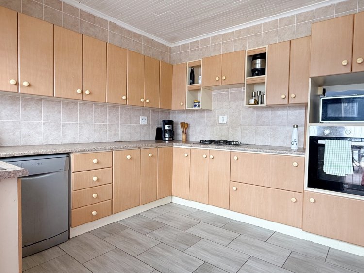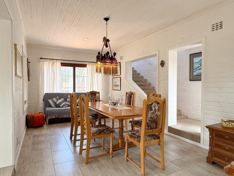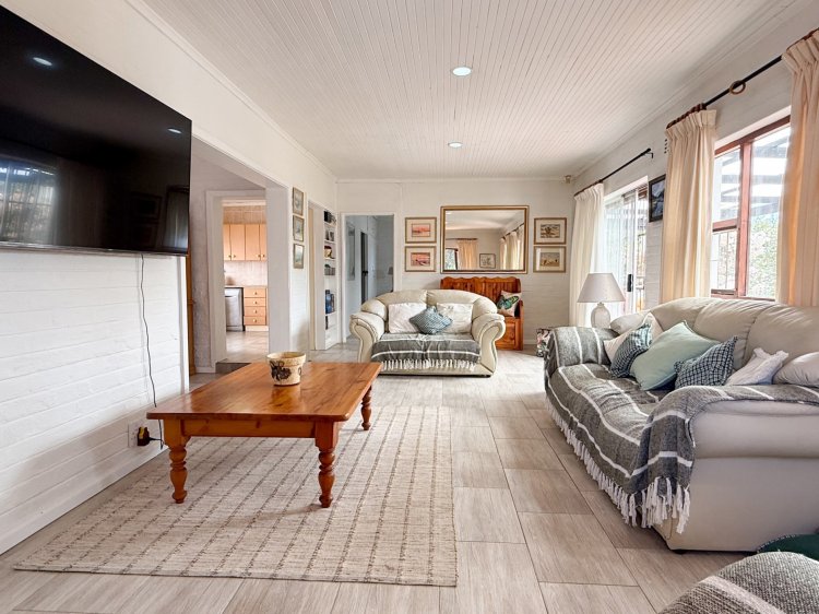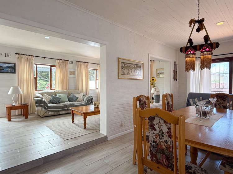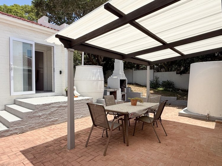 Interior living is light and airy, tiled throughout with a semi-open-plan design. The main living area comprises a spacious lounge, dining room, and a separate kitchen, which provides thoroughfare outdoors to west-facing entertainment. The kitchen, complete with melamine cabinetry, offers a gas hob with an electric oven, and ample cupboard space. West-facing entertainment is an absolute delight, sheltered from the prevailing winds and complete with built-in braai facilities and an undercover patio.