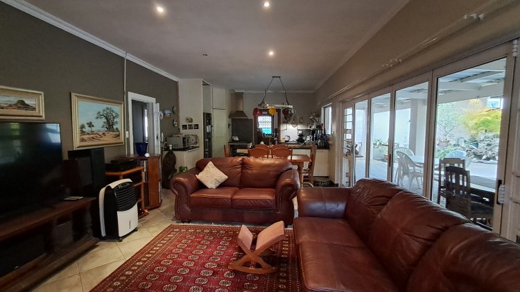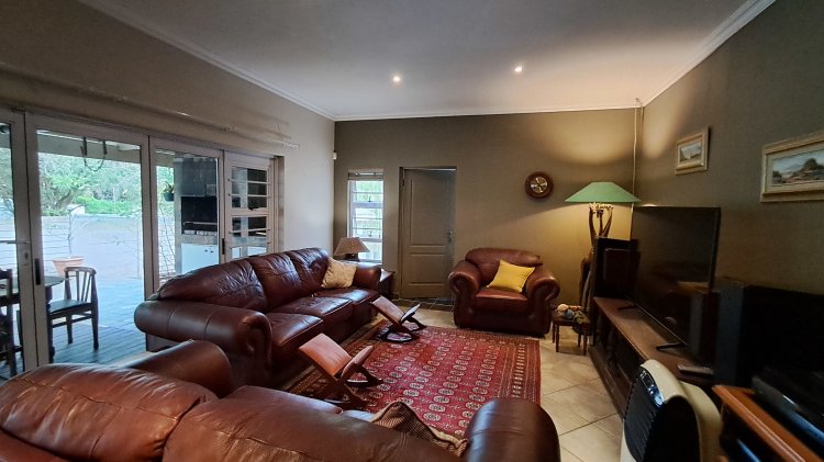 Open-plan tiled kitchen and lounge with stacking doors to a covered patio featuring a built-in braai