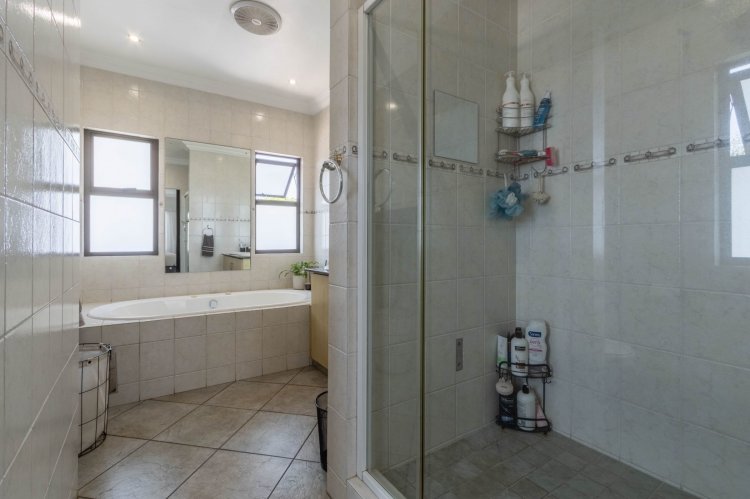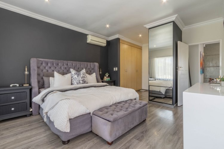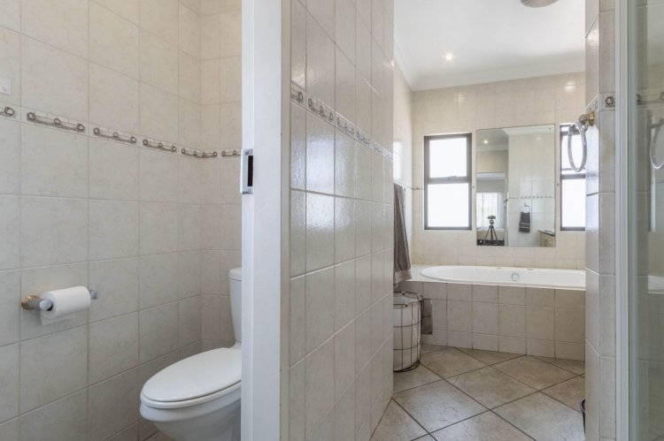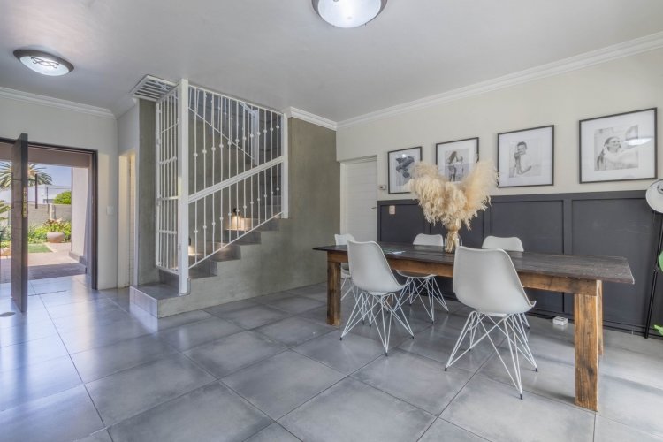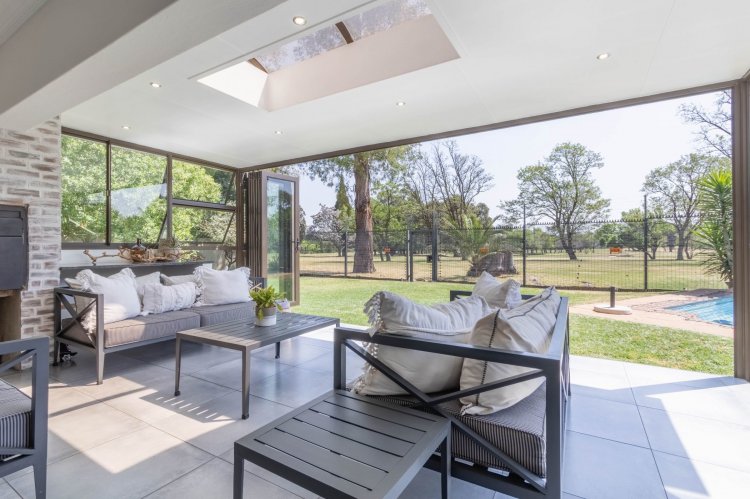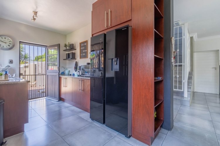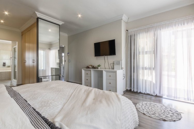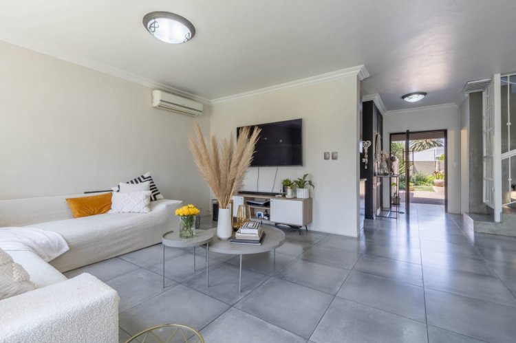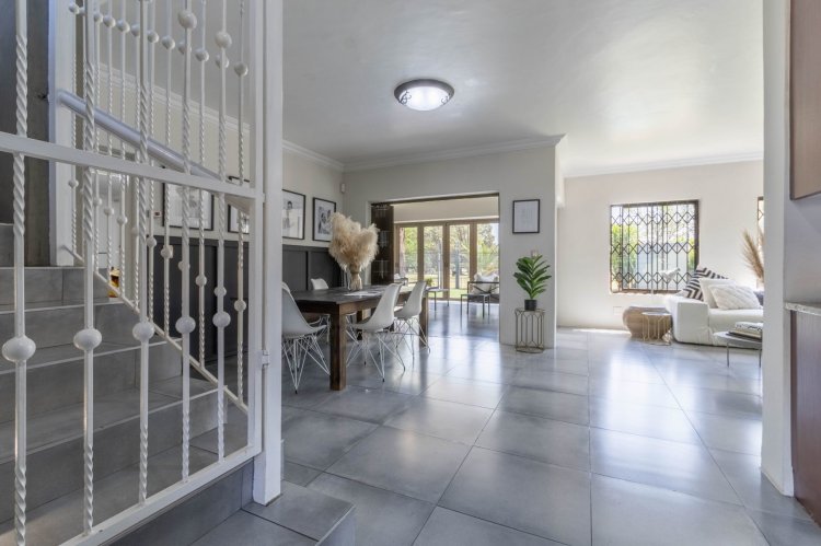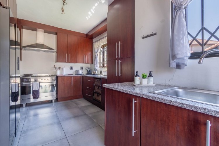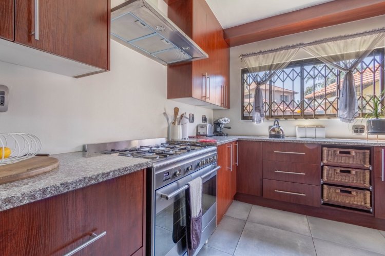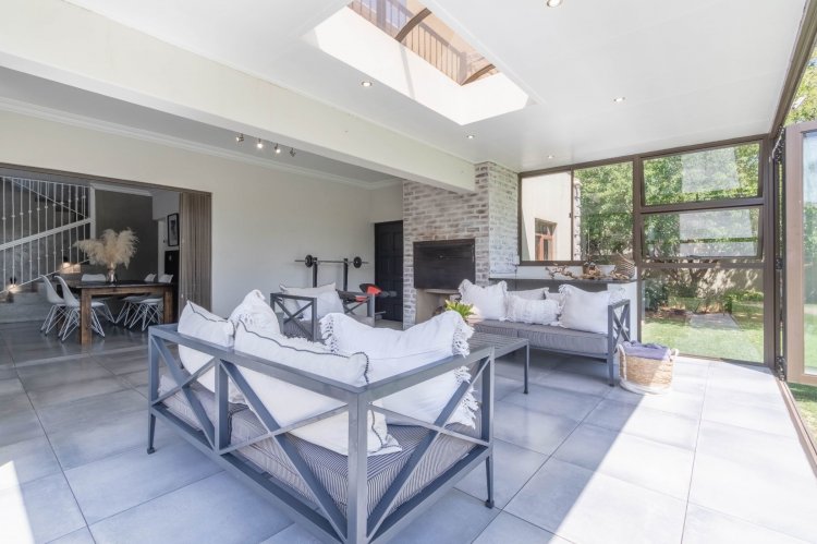 Downstairs features a generous open-plan layout with a lounge and dining area that flows seamlessly into an enclosed indoor braai and entertainment space, illuminated by a beautiful skylight. The modern kitchen boasts granite countertops, a 5-plate gas hob, undercounter oven, extractor fan, double-door fridge space, and a separate scullery.