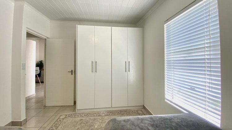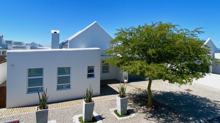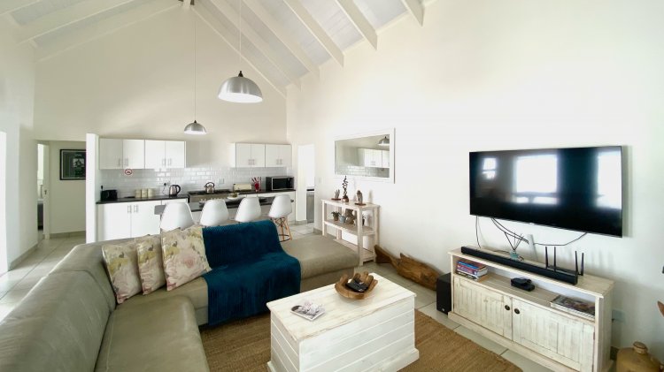 The property consists of a Spacious open-plan lounge, braai room, and kitchen with high ceilings, elegant pendant lighting, and sliding doors that open to a private courtyard—perfect for relaxed entertaining and coastal living.