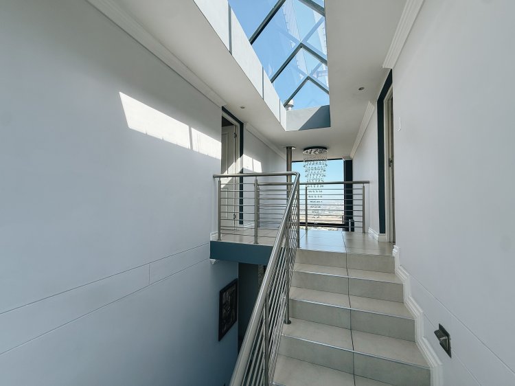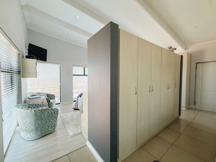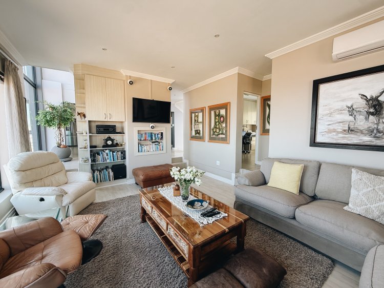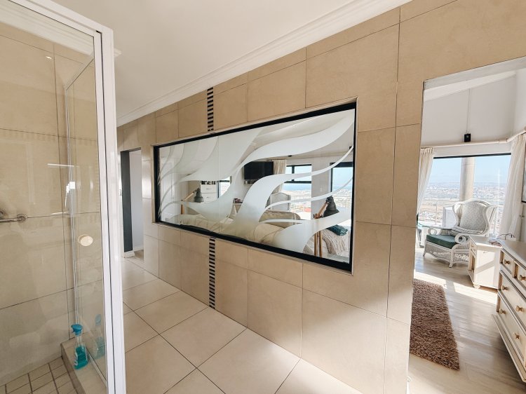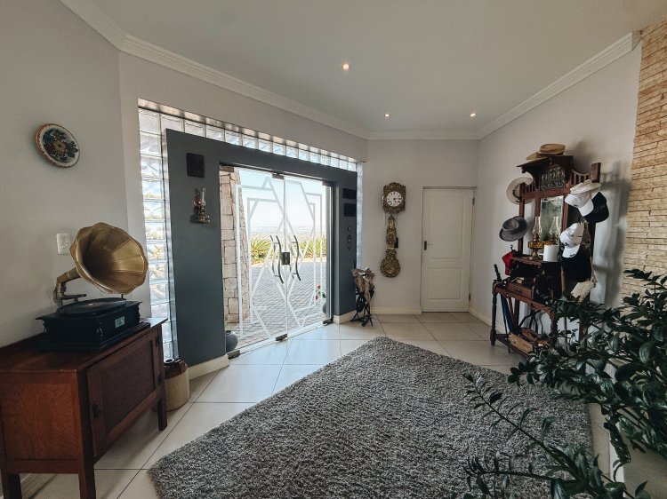 The expansive entertainment area features a stainless-steel braai and an unobstructed sea view that can be enjoyed even when the sleek frameless glass panels are closed.