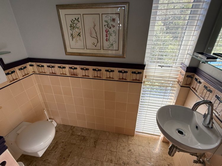 The home is light, bright, and has engineered wood flooring throughout. It features three spacious bedrooms, including a large main bedroom upstairs with a walk-in cupboard, full en-suite bathroom, and a private balcony. The other two bedrooms are downstairs and share a full bathroom. There is also a guest toilet for convenience. The house has lots of cupboard space, including handy built-in shoe drawers.