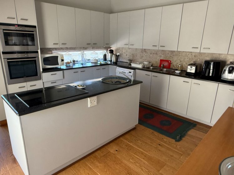 The open-plan dining area leads into a modern kitchen with a wooden countertop, electric hob, double oven, and a separate pantry. LED lights give the kitchen a clean, modern feel.