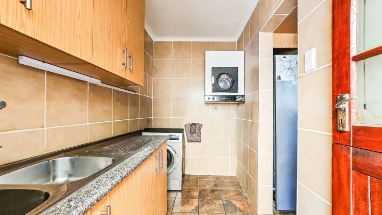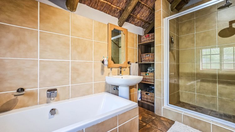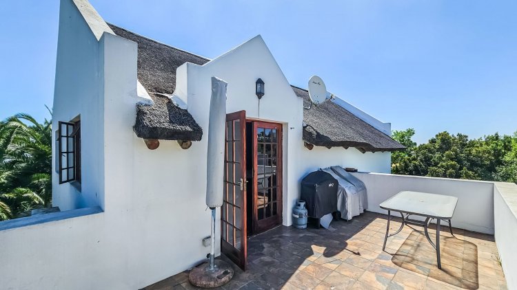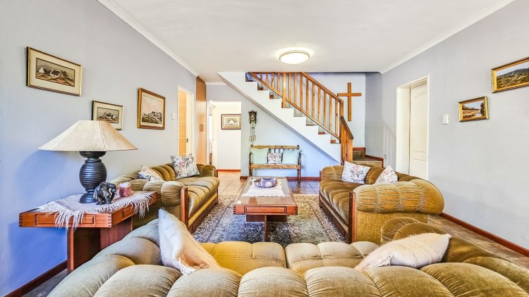 PROPERTY FEATURES • Two generous living areas – a lounge and kitchen with oven, hob, extractor fan, and scullery downstairs, plus a spacious top-floor entertainment area with double volume open rafter ceilings offering a diningroom/livingroom/kitchenette flowing to the patio • Double-volume ceilings with exposed rafters upstairs, creating an airy dining/living/kitchenette space that flows seamlessly to the patio • Three bedrooms and two full bathrooms • Single garage plus drive-through undercover parking that doubles as an expansive covered braai patio • Prime position right alongside the estate dam