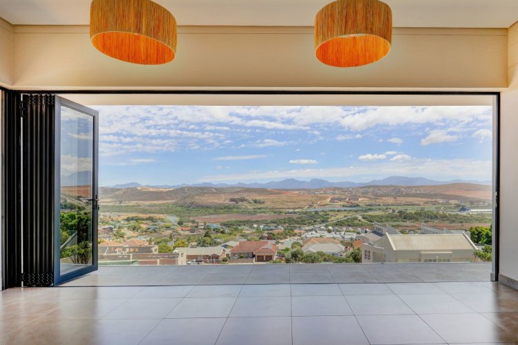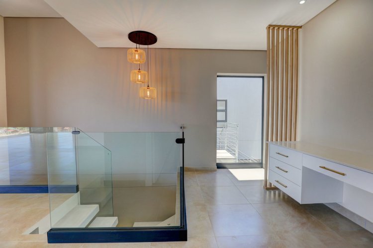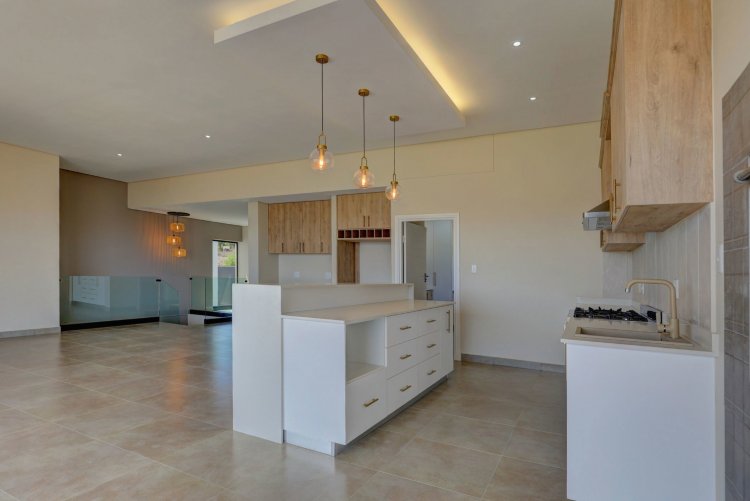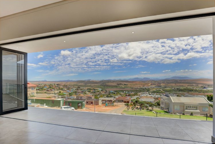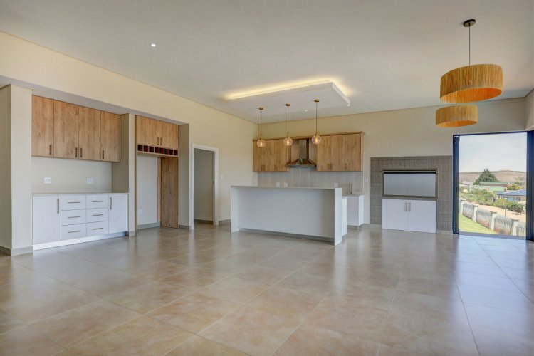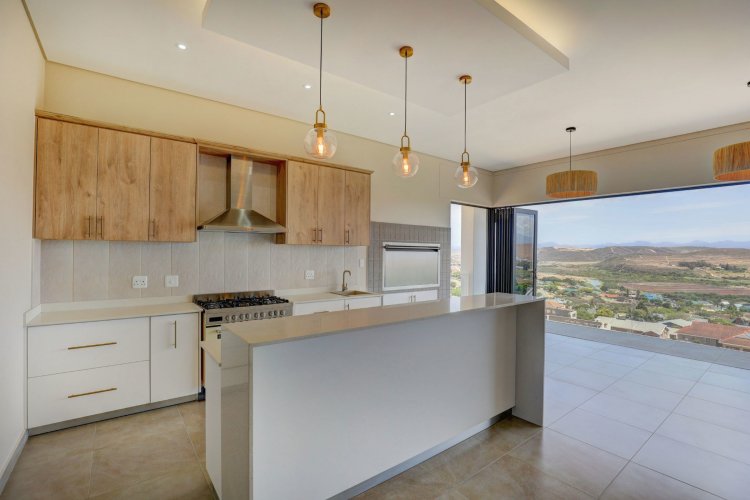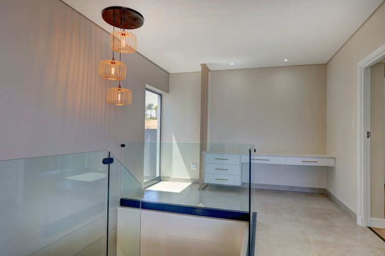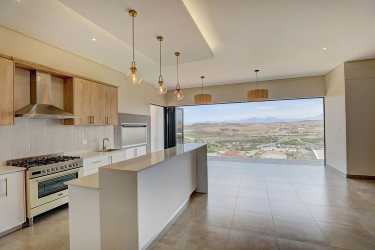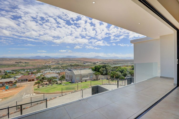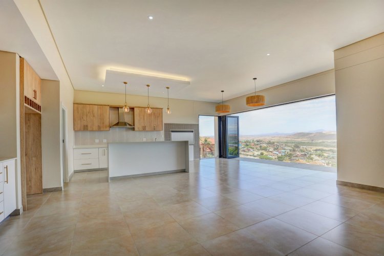 The upper level hosts the beautifully appointed main bedroom, a private retreat boasting panoramic vistas and a luxurious full en-suite bathroom. Thoughtfully designed, the en-suite includes a his-and-hers basin, spacious shower, relaxing bath, and modern finishes that elevate daily living into a spa like experience. A stylish guest toilet is conveniently located on this level, as well as the heart of the home. An open-plan living area that leads onto a generous balcony where views stretch endlessly. The built-in indoor braai ensures year-round entertaining, whether you're hosting guests or enjoying quiet evenings surrounded by scenic beauty.