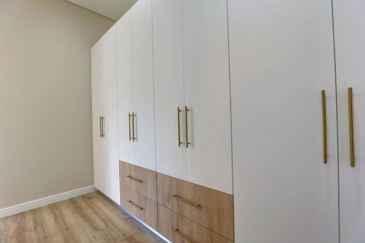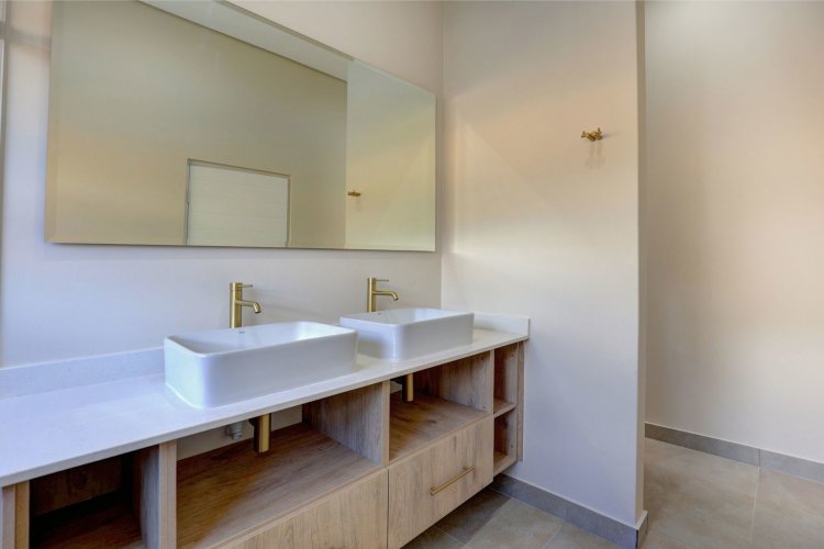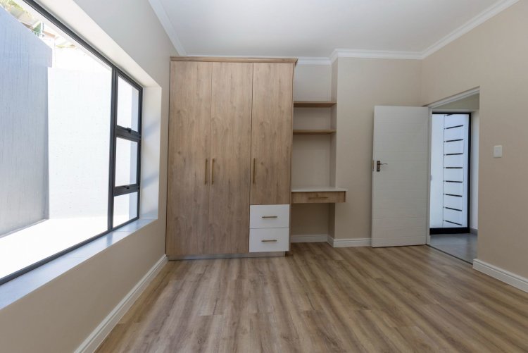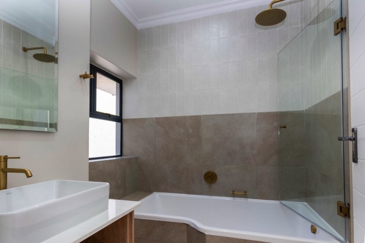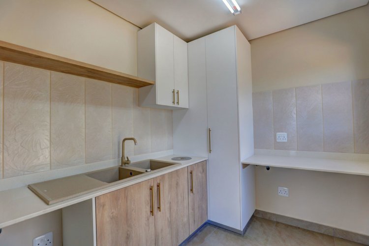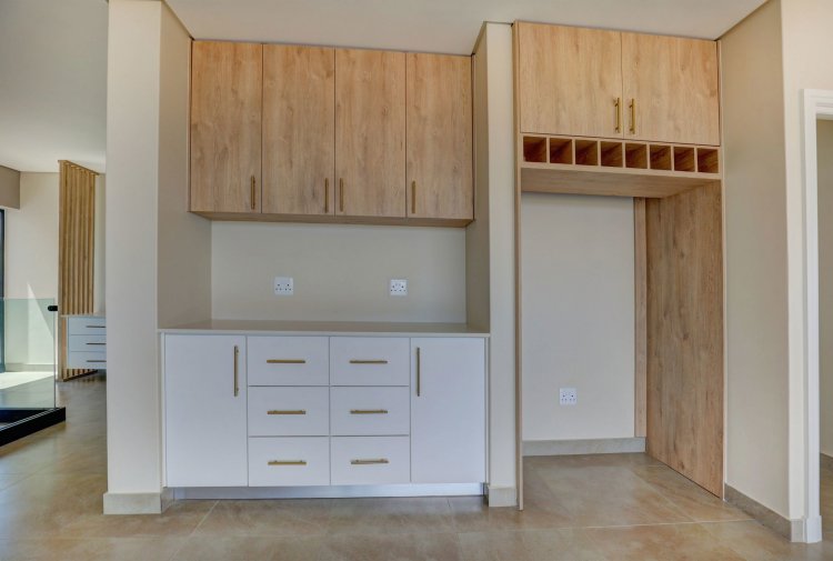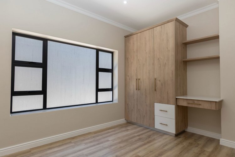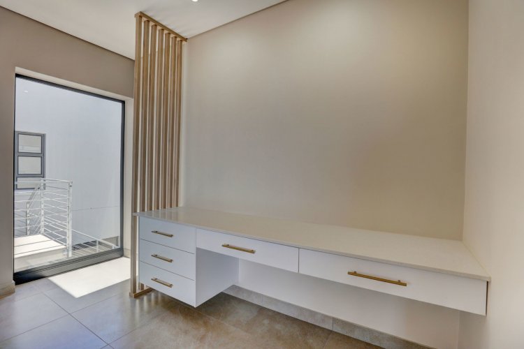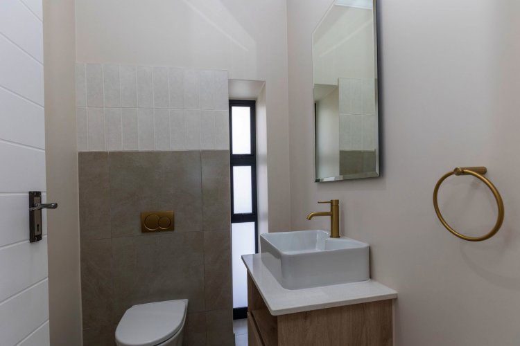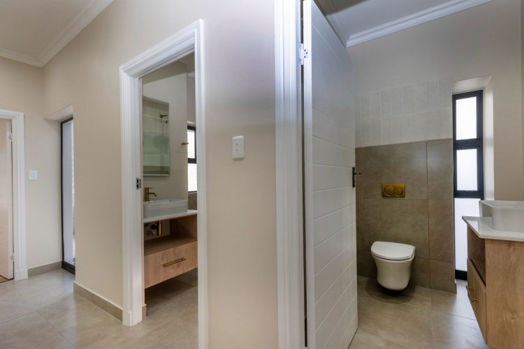 The lower level offers two additional bedrooms, each filled with natural light and warmth. A contemporary guest bathroom, fitted with a shower, basin, and toilet, complements this space. A dedicated study nook provides the ideal spot for remote work or quiet productivity, while the separate scullery keeps the main living areas streamlined and clutter-free.
