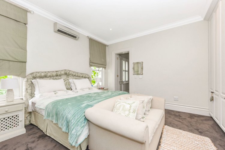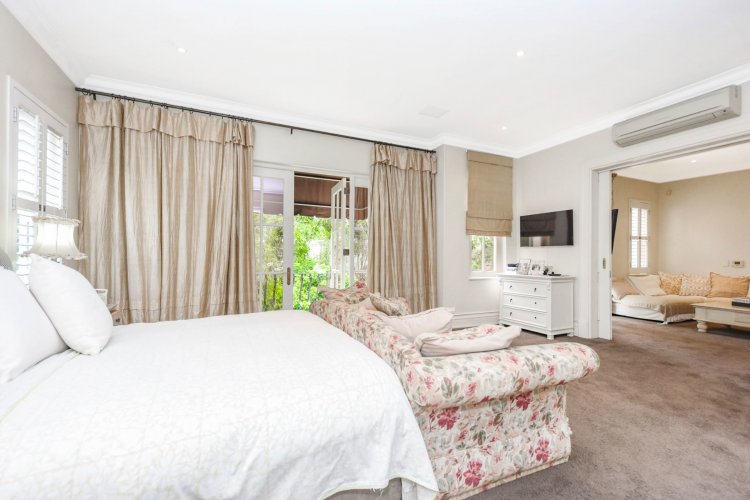 Ascending the marble staircase, the upper level reveals four generously proportioned bedrooms. Two bedrooms enjoy en suite bathrooms, while the remaining two are serviced by a stylish freestanding bathroom. The master suite is a true sanctuary, boasting air conditioning, a walk-in dressing room, a full en suite bathroom, and a private balcony fitted with an awning for shaded relaxation. A comfortable pyjama lounge completes this level, creating a shared family space away from the privacy of the bedrooms.