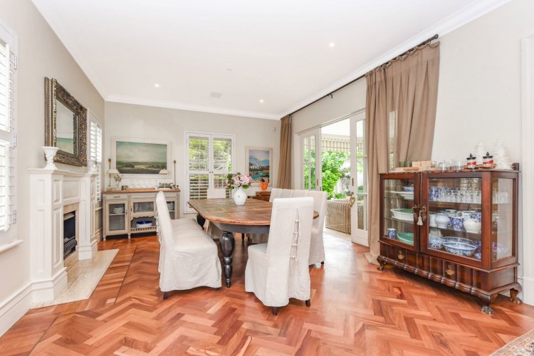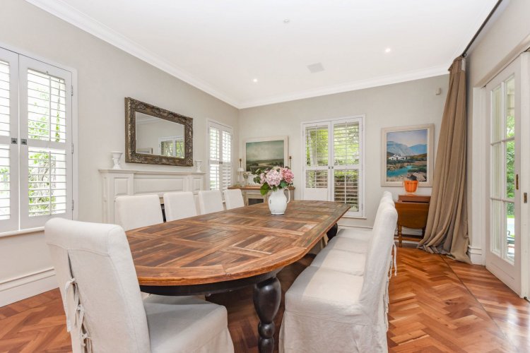 To the left of the entrance hall, the formal lounge leads through to the elegant formal dining room, both anchored by a striking gas fireplace that provides ambience and comfort during cooler winter evenings. All four reception areas open seamlessly onto the covered patio via glass sliding doors, enhanced by drop-down blinds for year-round enjoyment. The patio overlooks the landscaped garden and sparkling swimming pool, offering a private oasis for outdoor entertaining.