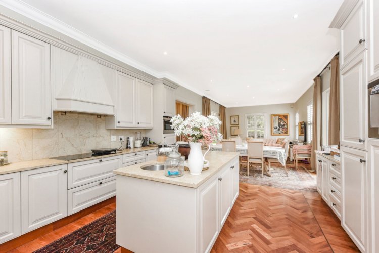 Step through the stunning ivory French doors into a grand double-volume entrance hall that immediately sets the tone for the home's timeless sophistication. To the right lies the heart of the home: a beautifully appointed kitchen featuring a centre island, granite countertops, glass hob, double eye-level ovens, microwave oven, and a built-in fridge and freezer. The adjoining scullery mirrors the kitchen's premium finishes and accommodates up to two appliances, ensuring both practicality and aesthetic continuity. The kitchen flows effortlessly into the informal dining area and family TV room, creating a warm and inviting space for relaxed living and entertaining.
