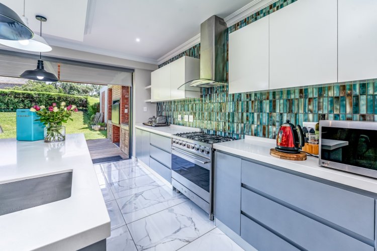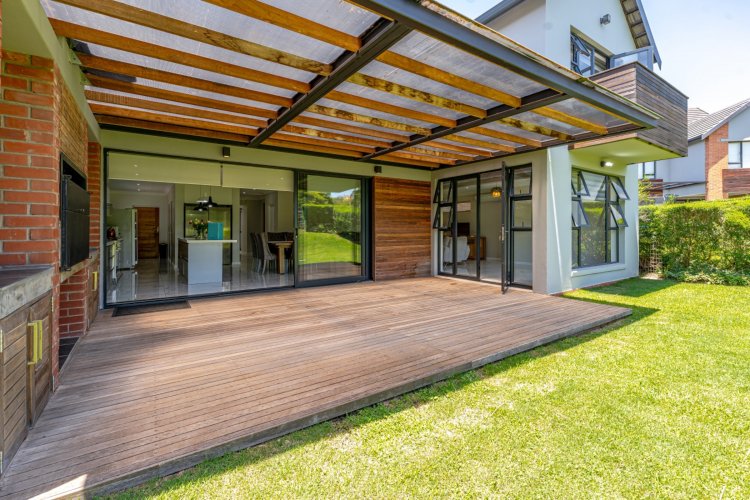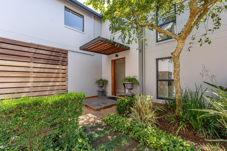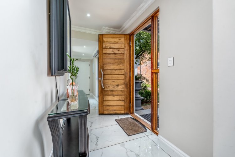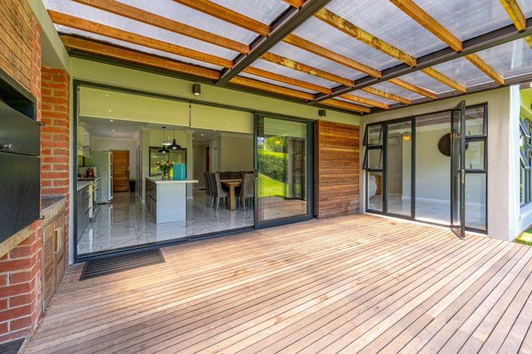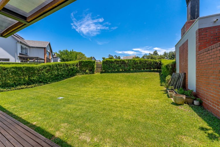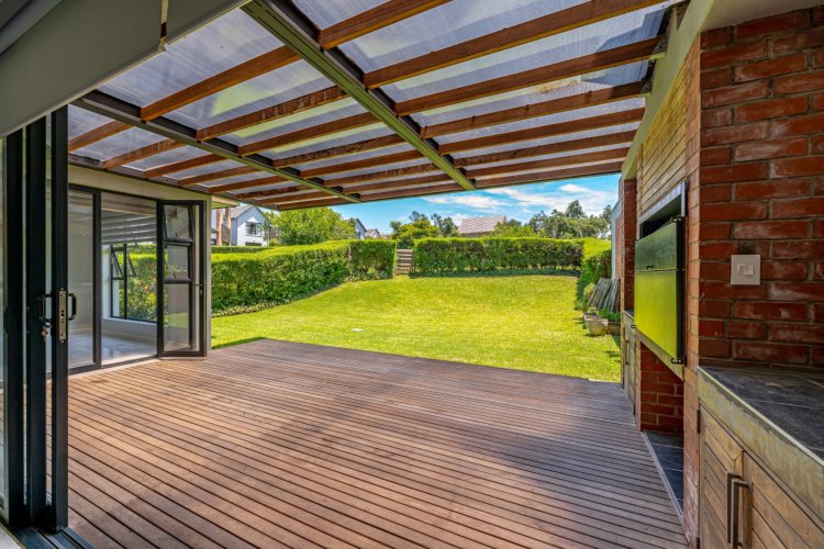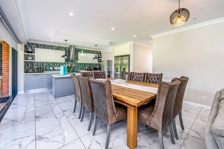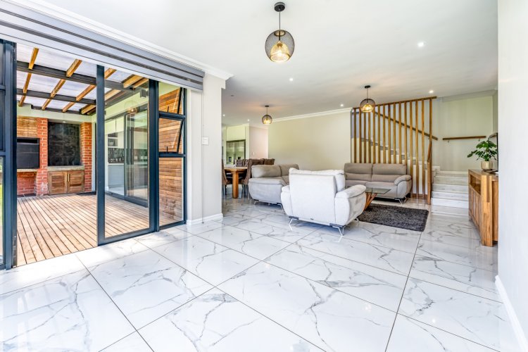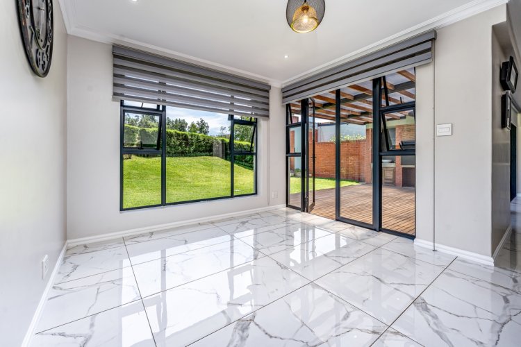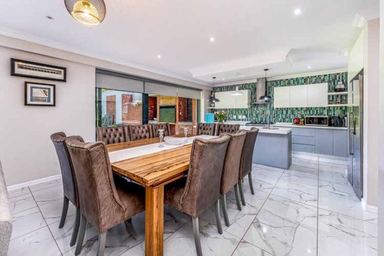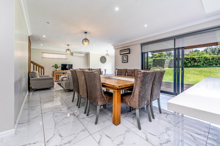The dining area and formal lounge flow effortlessly through sliding doors to a covered patio, creating an ideal indoor-outdoor entertaining environment. The enclosed garden offers privacy and overlooks a servitude, enhancing the sense of space.