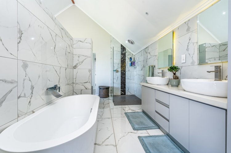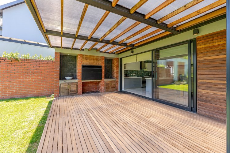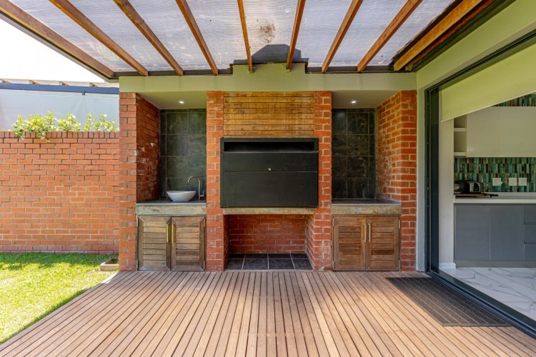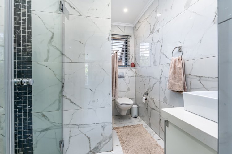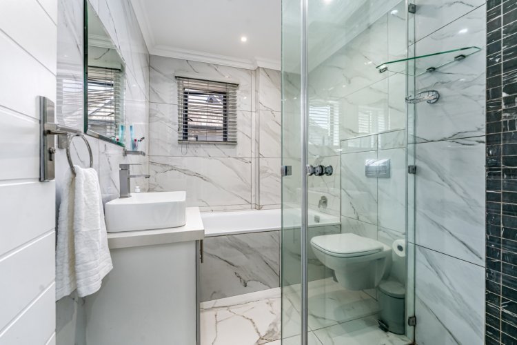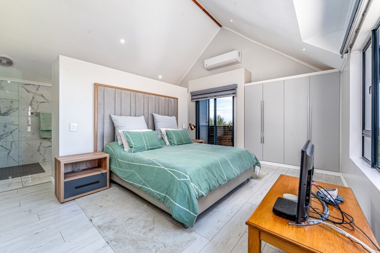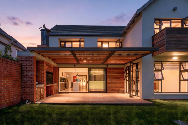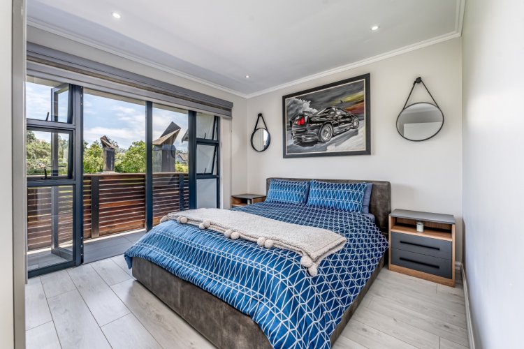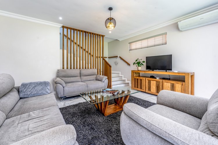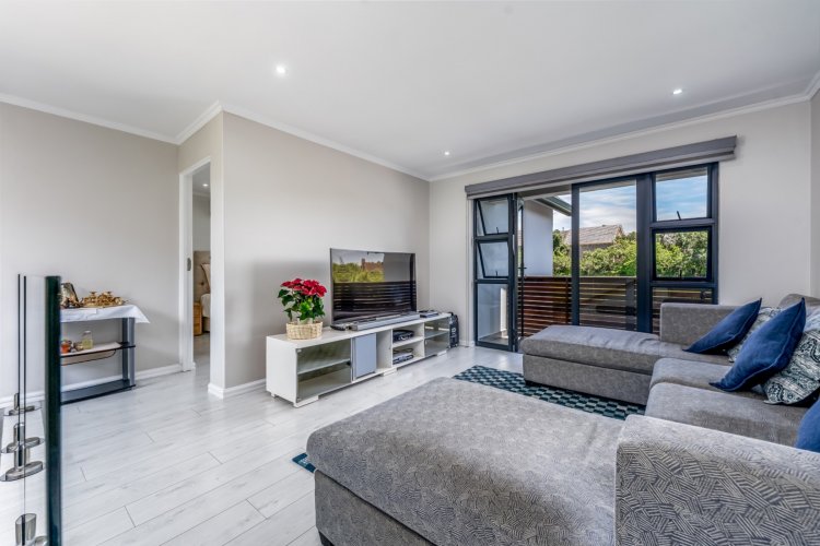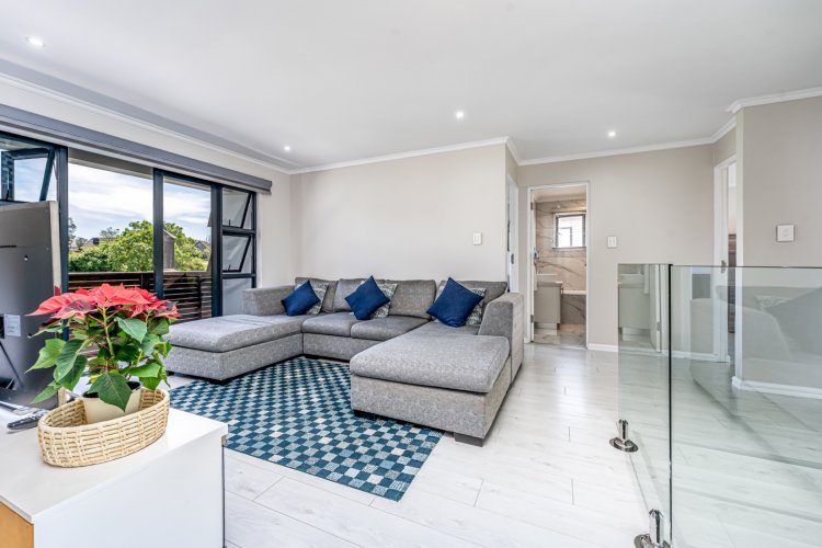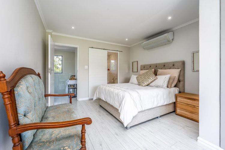 The dining area and formal lounge flow effortlessly through sliding doors to a covered patio, creating an ideal indoor-outdoor entertaining environment. The enclosed garden offers privacy and overlooks a servitude, enhancing the sense of space.