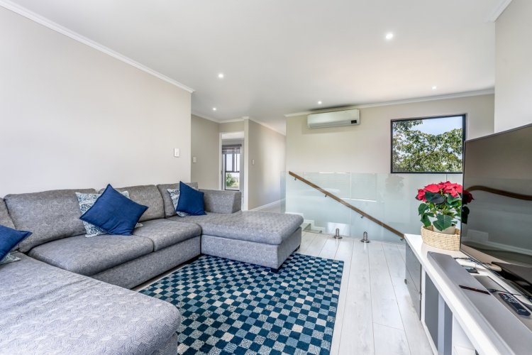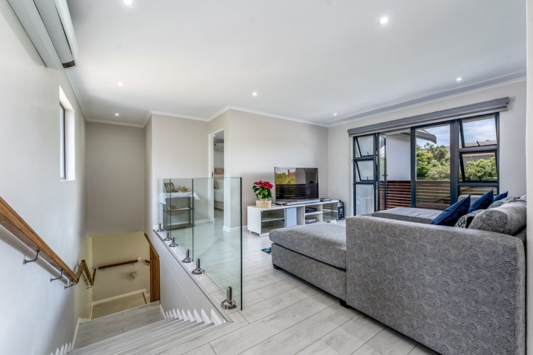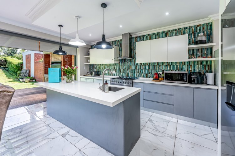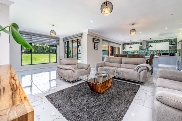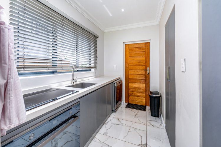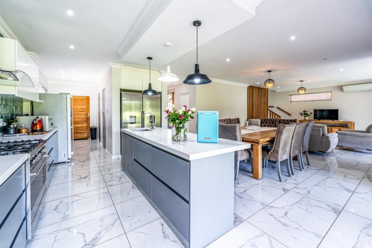 An upstairs pyjama lounge with balcony provides a tranquil retreat for relaxed family living. Downstairs, the home showcases expansive open-plan living areas centred around a contemporary designer kitchen with a statement centre island, freestanding gas hob with electric oven, abundant cabinetry, a separate scullery with walk-in pantry, and a dedicated laundry room.
