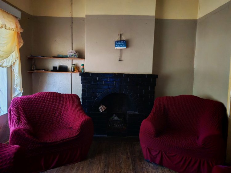 The home offers a practical and well-designed layout, featuring a kitchen with Novilon flooring, a single sink, and steel-framed windows. The dining room, with its wooden floors, creates a warm and inviting space for family meals, while the living room also features wooden flooring and a fireplace, providing a comfortable and welcoming area for everyday living. A functional laundry room with cement flooring and tiled finishes completes this section of the home.