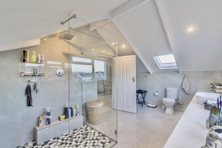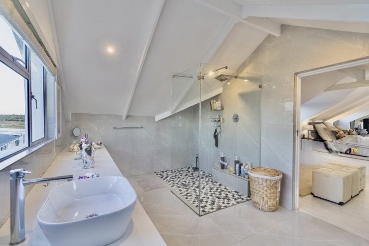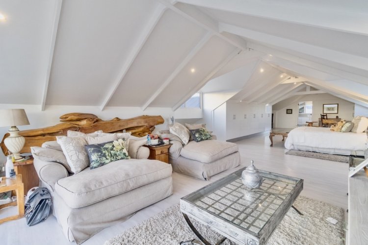 Upstairs Layout: Main Suite: The expansive upstairs space boasts an open-plan layout with a large main bedroom, dressing area, and bathroom. A cozy chilling area adds to the relaxed atmosphere of this floor.