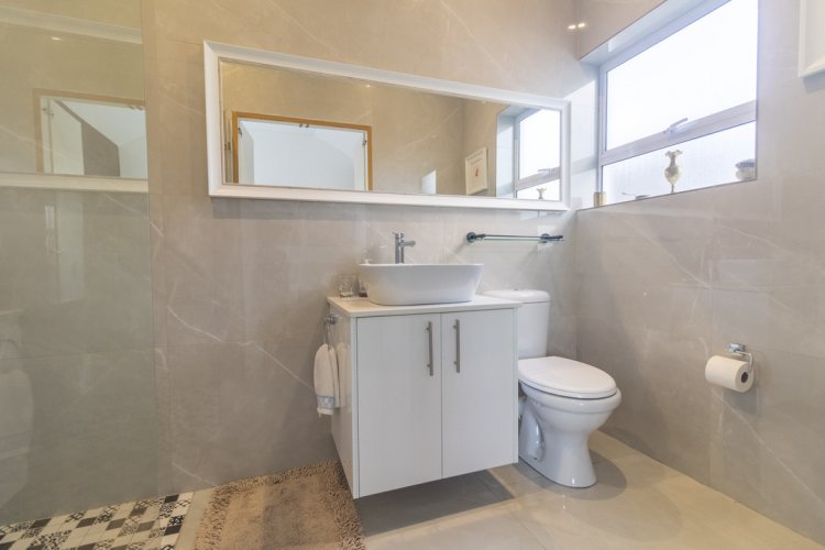 Guest Bathroom: A thoughtfully designed guest bathroom includes built-in linen cupboards, enhancing the functionality of the space.