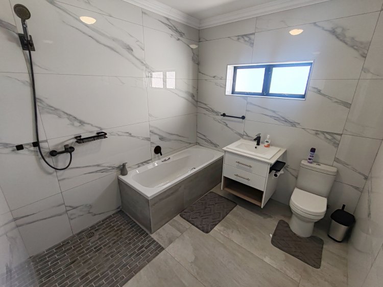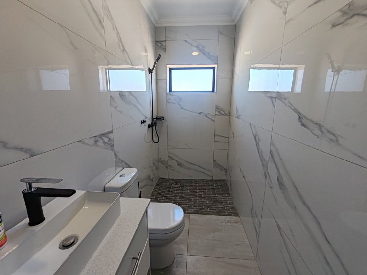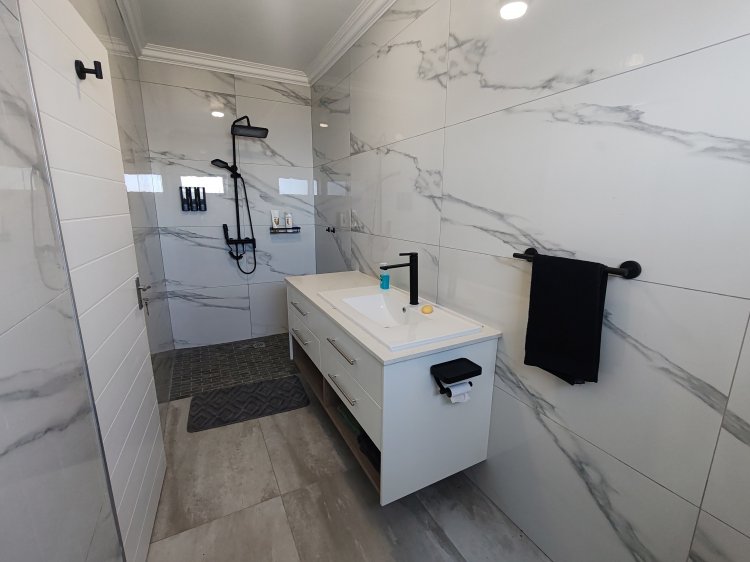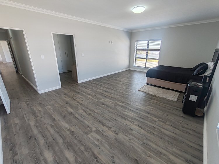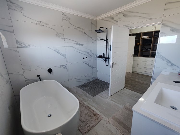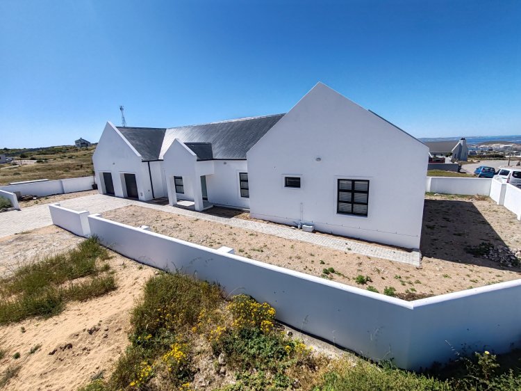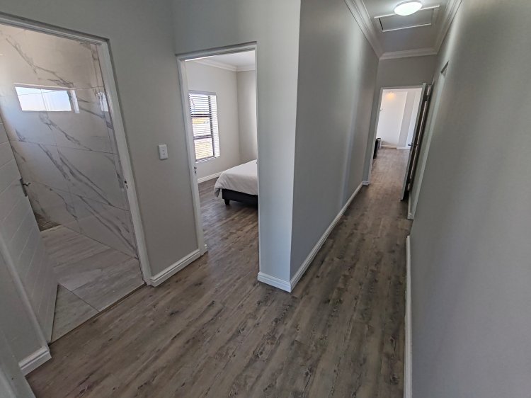 The open-plan kitchen, lounge and dining area create a warm and inviting atmosphere. From here, you walk out onto a patio with a built-in braai, overlooking the estate and offering beautiful views of Saldanha Harbour.
