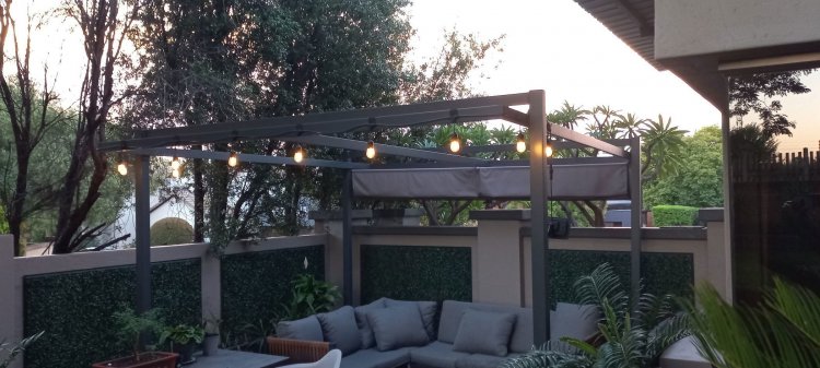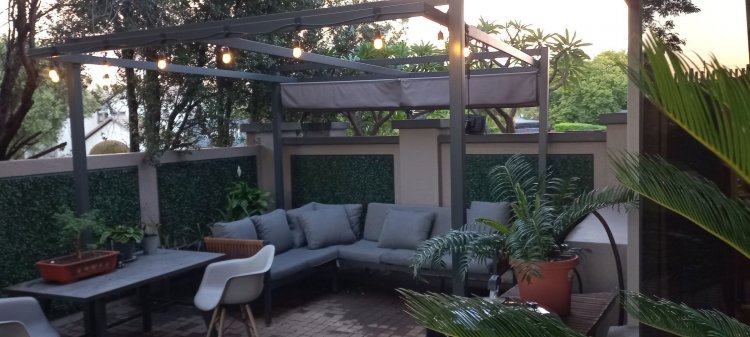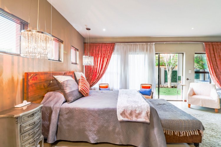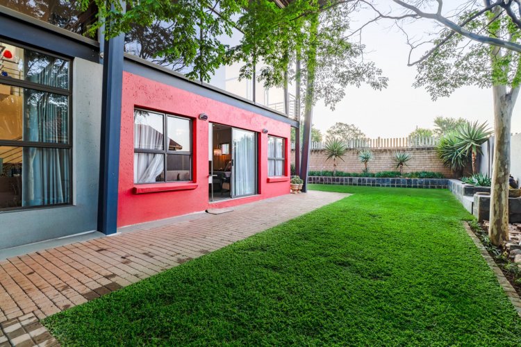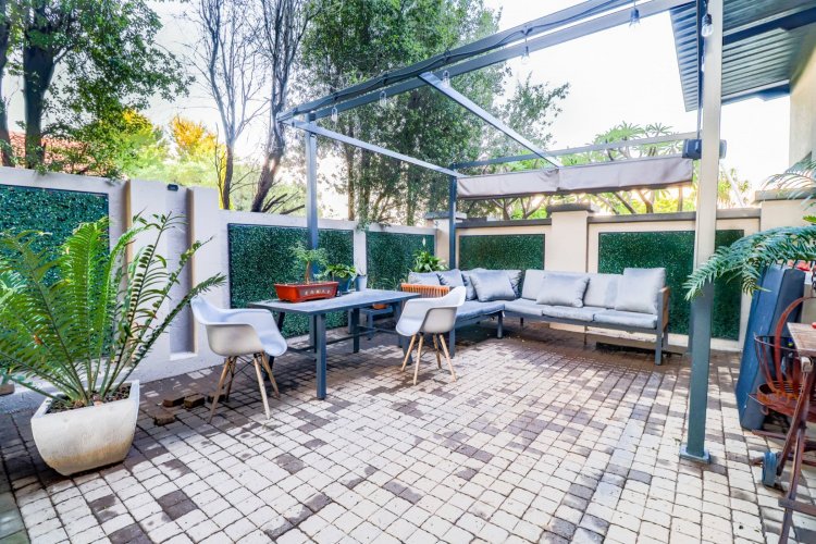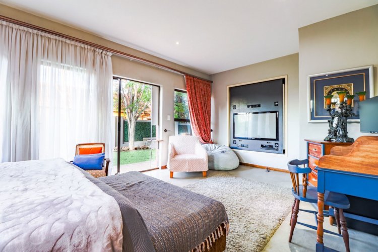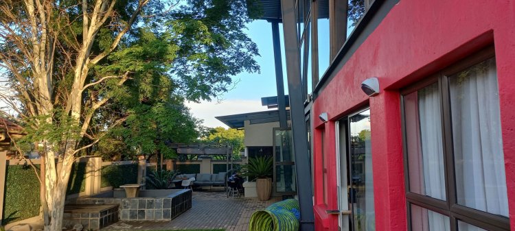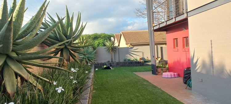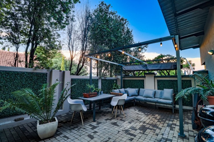 Glass doors open to a tranquil, landscaped garden where nature takes centre stage. The koi pond, soft water movement, and leafy surroundings create a peaceful backdrop for morning coffee, weekend braais, or quiet evening unwinding on the covered patio.