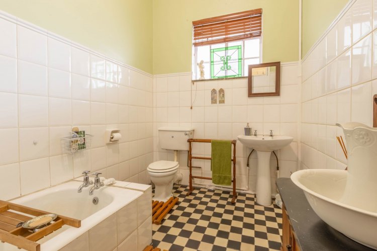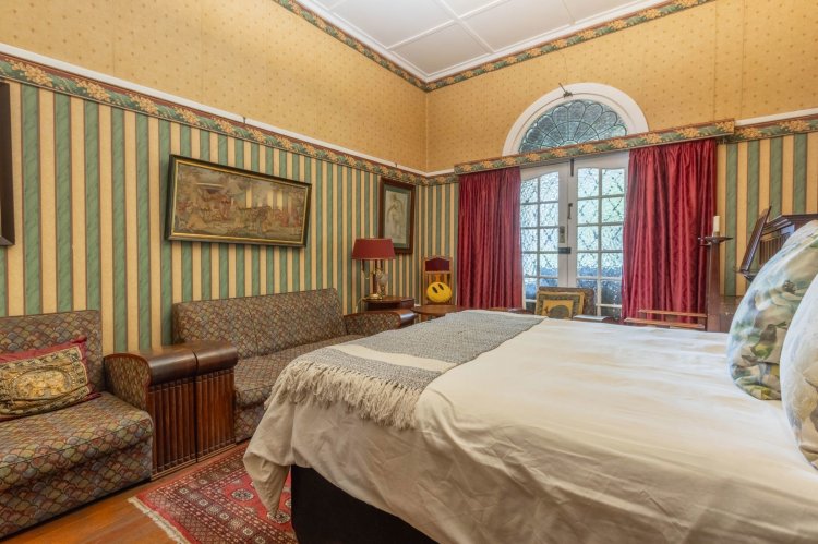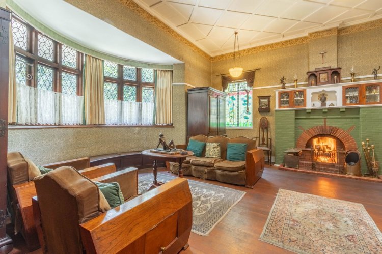 Inside, the home welcomes you with a charming entrance hall featuring original cottage-pane windows and vintage tiles. The reception areas include an inviting entrance lounge with a wood fireplace, a spacious formal lounge with an anthracite fireplace, and an elegant dining room with sliding doors, a bay window and a second fireplace. A cosy breakfast room with wooden floors and another fireplace leads into a bright sunroom, creating warm and versatile living spaces.