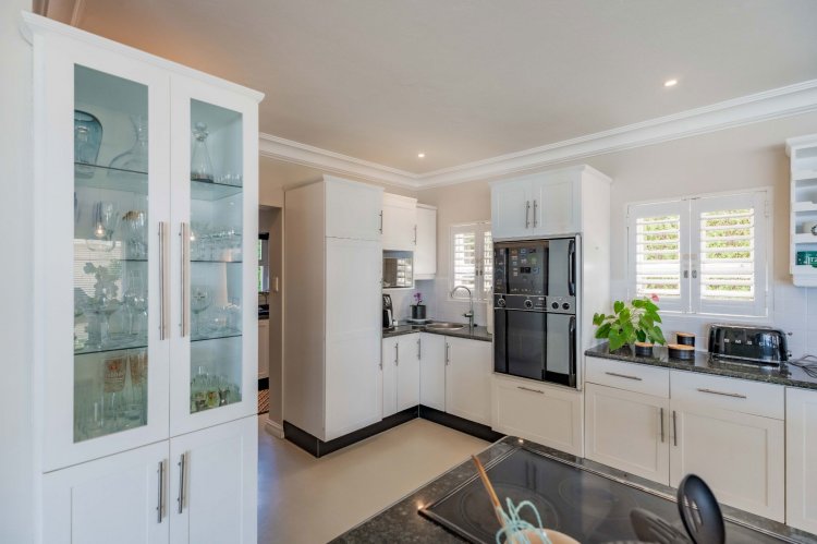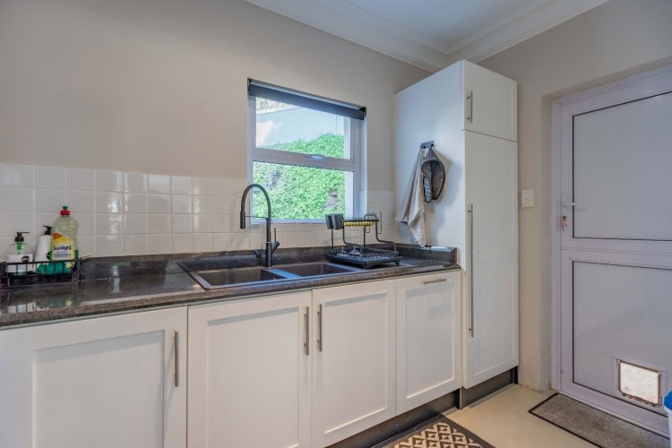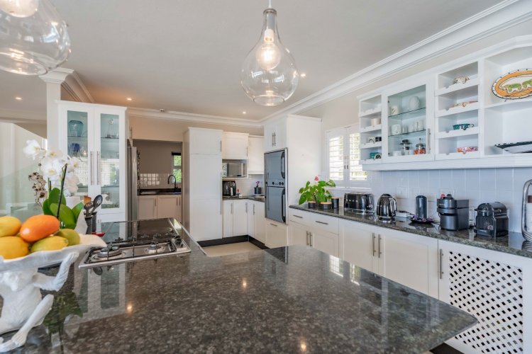 The heart of the home is a modern granite kitchen, fitted with a double-door eye-level oven, gas and glass stove plates, and a separate scullery. Open-plan dining and living areas flow effortlessly onto a covered entertainment patio, overlooking the pool and deck.