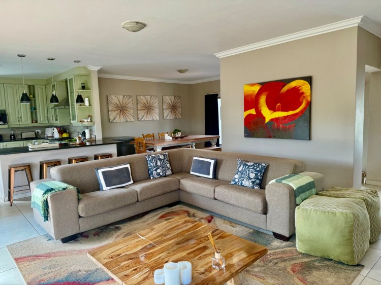 The open-plan living areas are bright and welcoming, including a spacious lounge, dining area, and a modern kitchen with a gas stove, electric oven, and a scullery for added practicality.