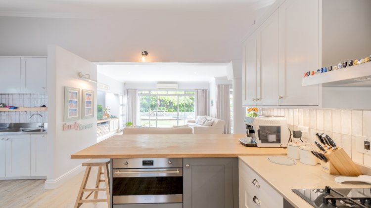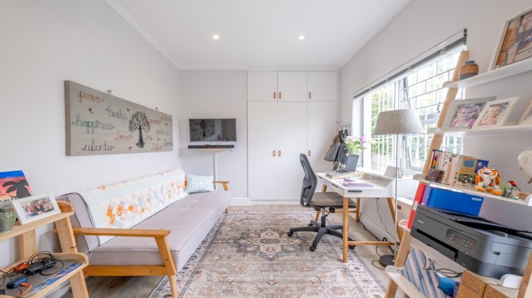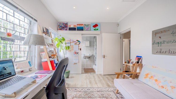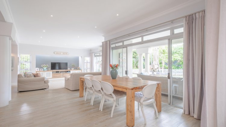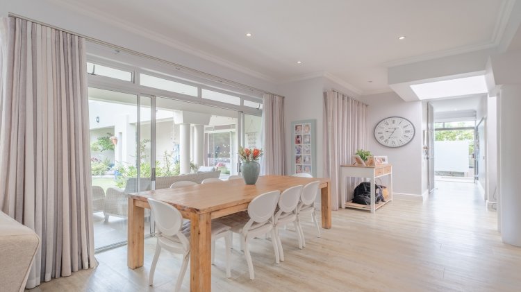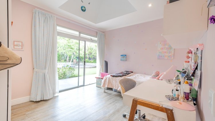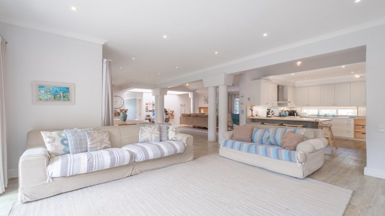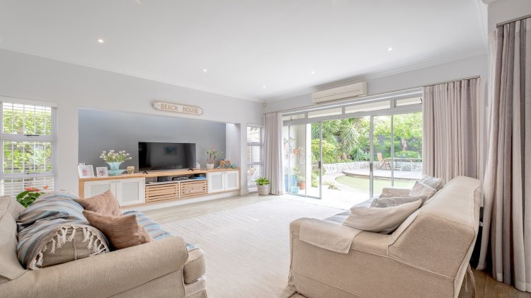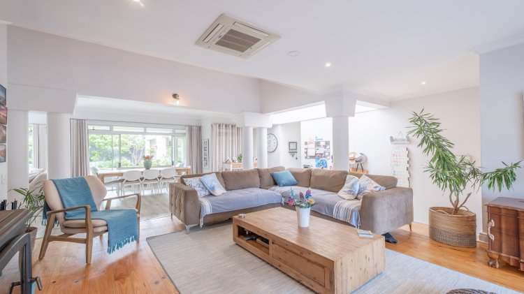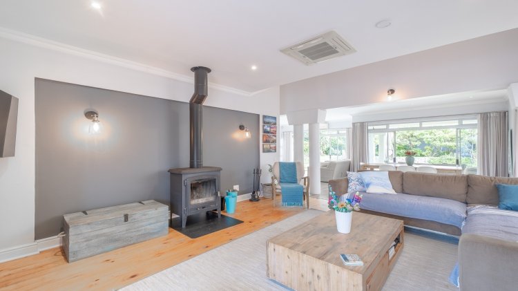 The expansive living area includes two lounges, a dining room, and a modern kitchen fitted with caesarstone counters, a 900mm Smeg gas stove, and a separate scullery and laundry. The living space is enhanced by a cozy wood-burning fireplace, air-conditioning, and doors that open to a lush, established garden — perfect for family gatherings and outdoor relaxation.