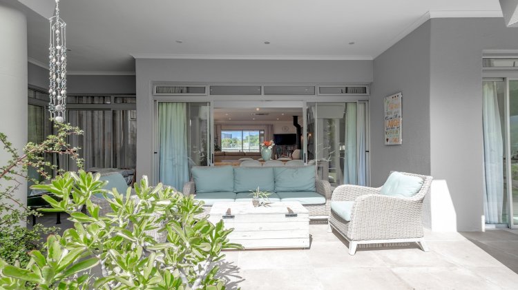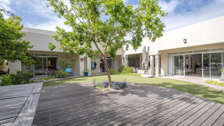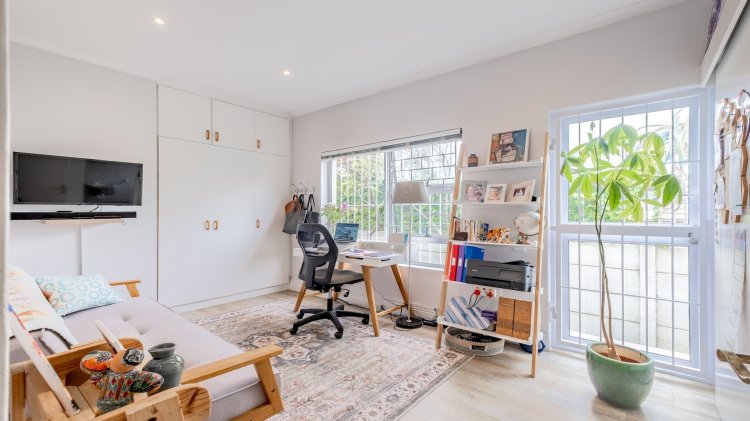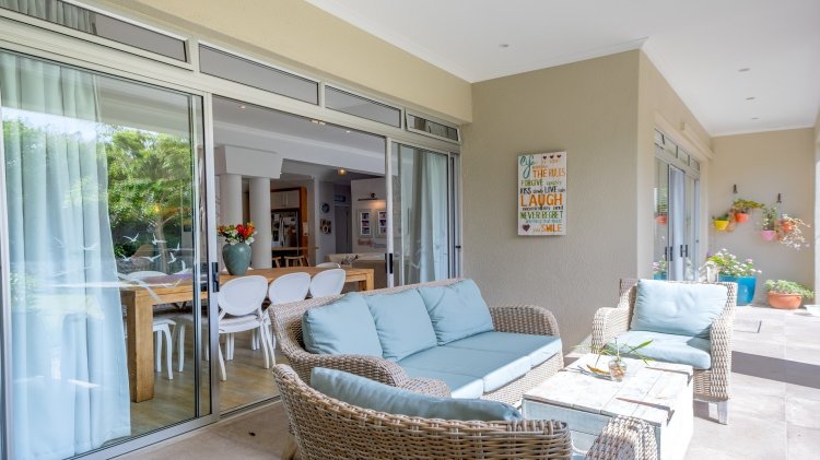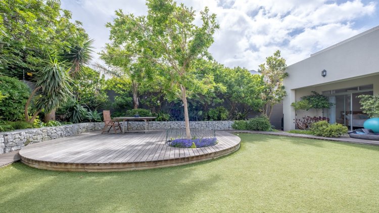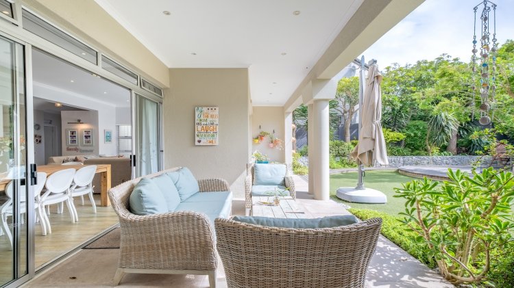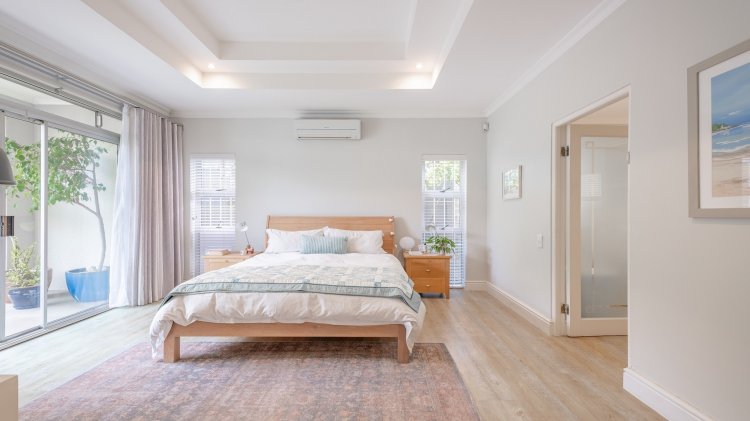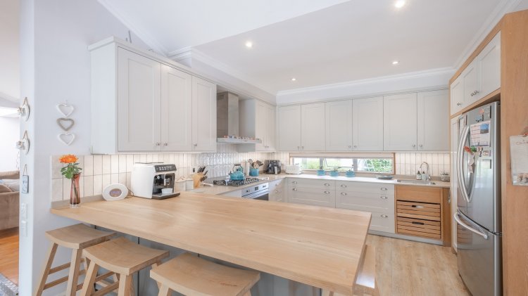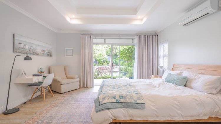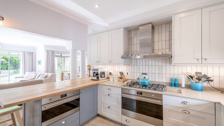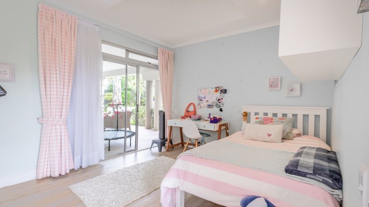 The expansive living area includes two lounges, a dining room, and a modern kitchen fitted with caesarstone counters, a 900mm Smeg gas stove, and a separate scullery and laundry. The living space is enhanced by a cozy wood-burning fireplace, air-conditioning, and doors that open to a lush, established garden — perfect for family gatherings and outdoor relaxation.