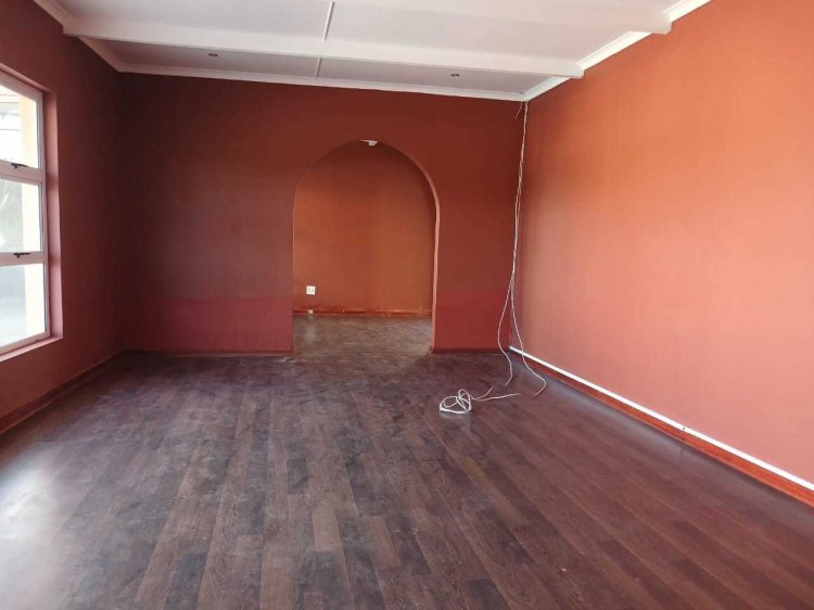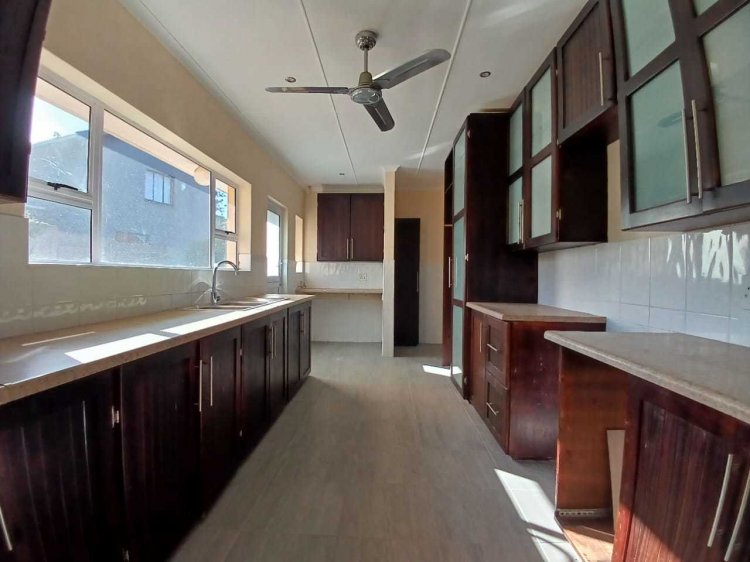 This spacious home features 4 well-sized bedrooms, including a guest bedroom with its own ensuite bathroom, perfect for visitors. There are 3 bathrooms in total. The living spaces include a guest lounge leading into the dining area, a TV lounge, and a kitchen that could use some modern upgrading. Floors throughout the home are a mix of laminate and tiles, providing easy maintenance and cleaning.