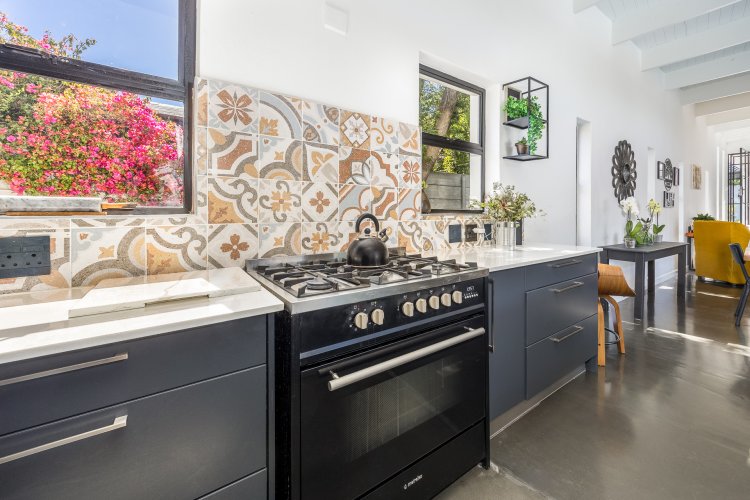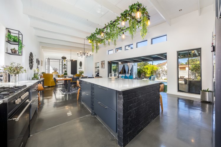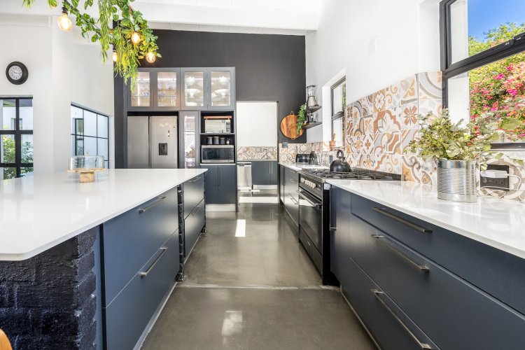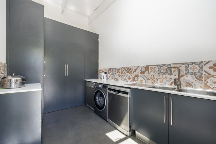 Modern kitchen with island, scullery, gas stove and ample cupboards