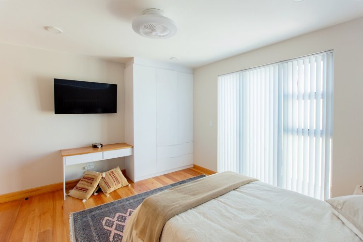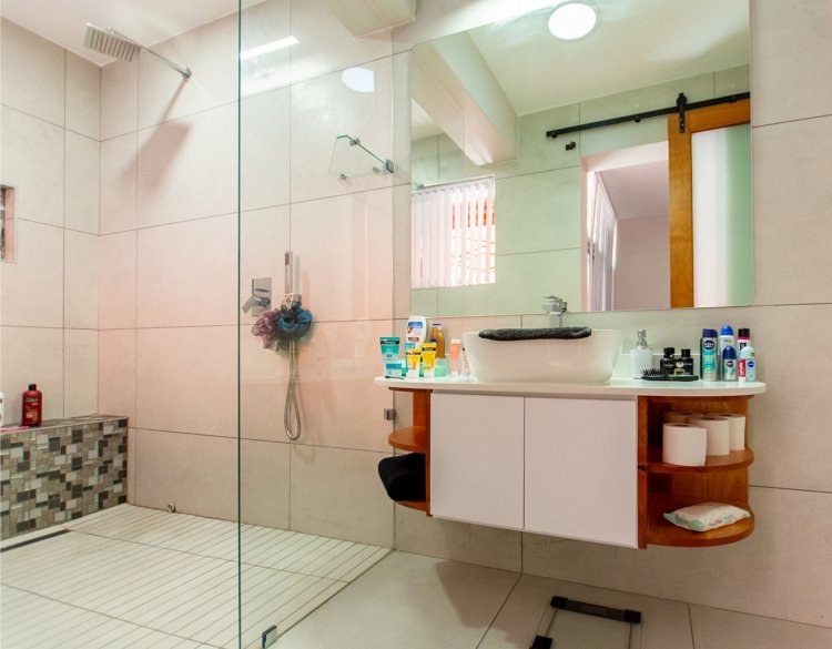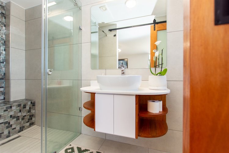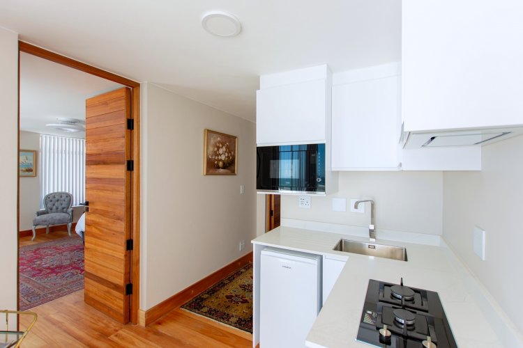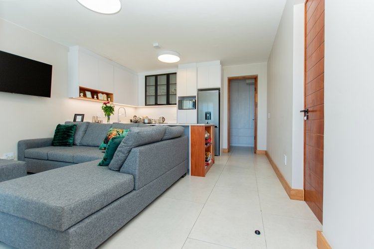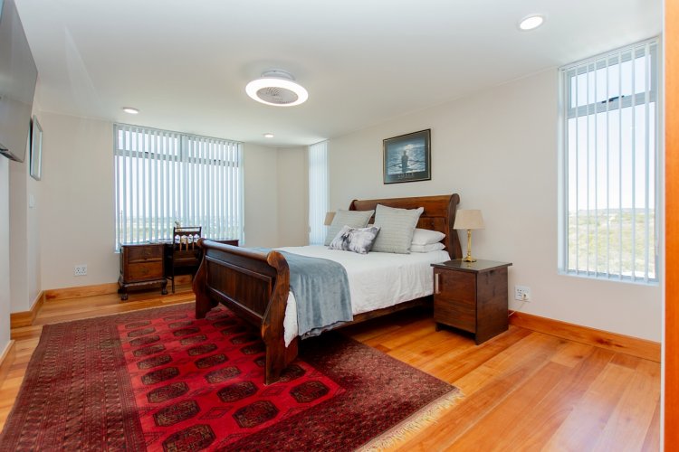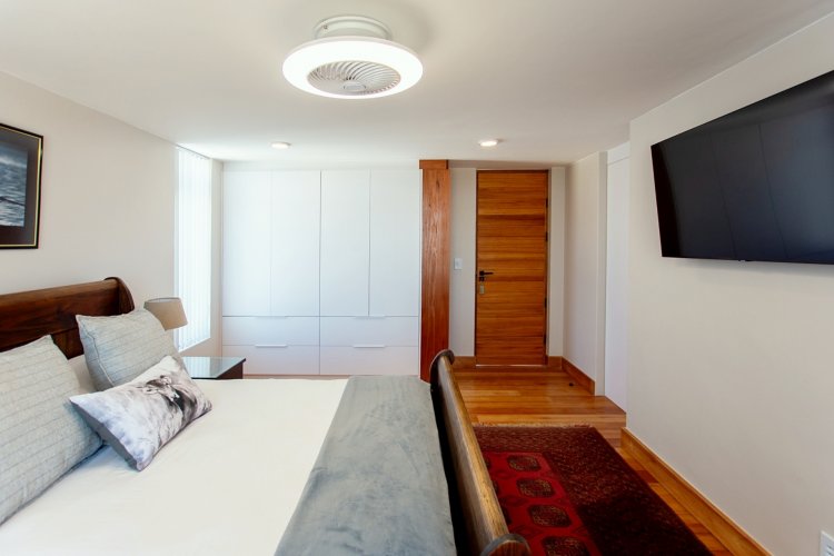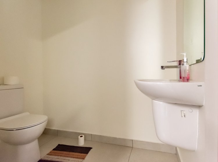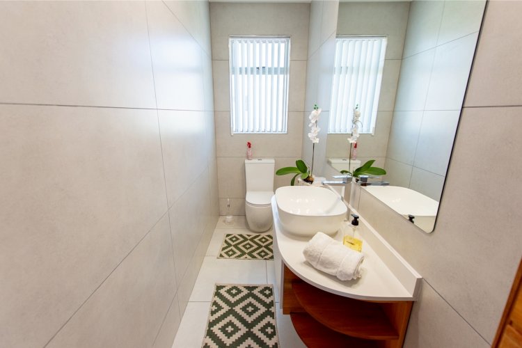 The generously sized bedrooms each come with remote-controlled ceiling fans, mounted TVs, and stylish lighting. All bedrooms feature en suite, state-of-the-art bathrooms, with one bathroom thoughtfully serviced by a gas geyser for enhanced efficiency. A guest WC with a hand basin adds further convenience for visitors. The master suite is an exceptional retreat, offering a walk-in closet, a private kitchenette with a small gas hob and built-in oven/microwave, and a shared service area for the adjacent guest bedroom.