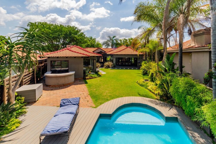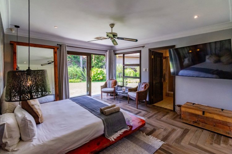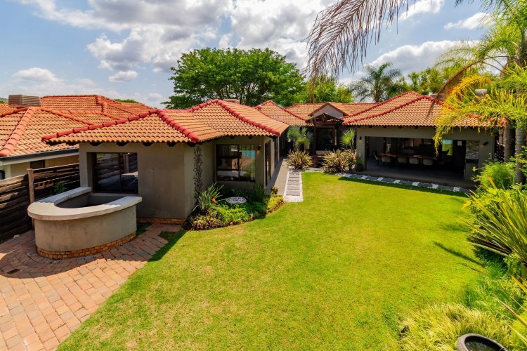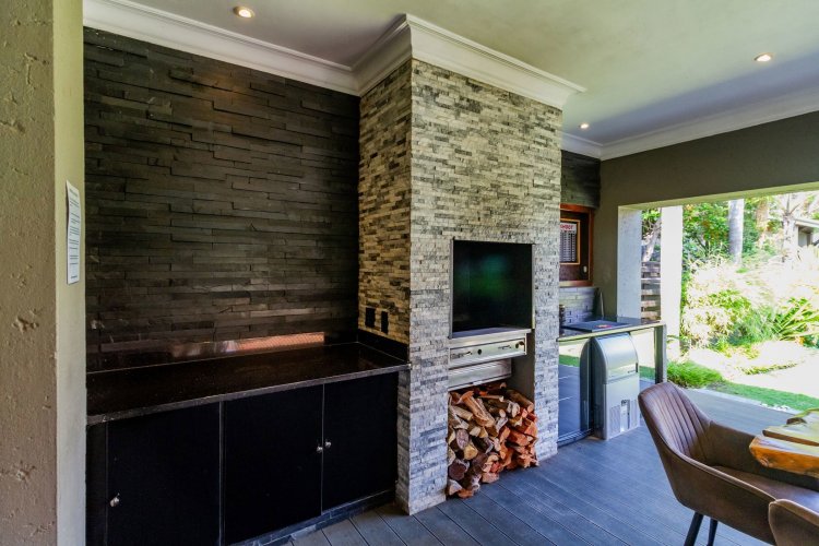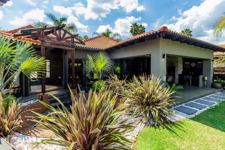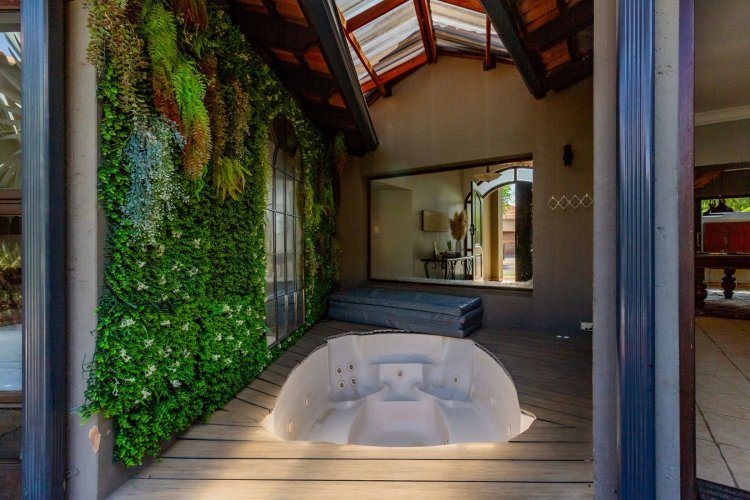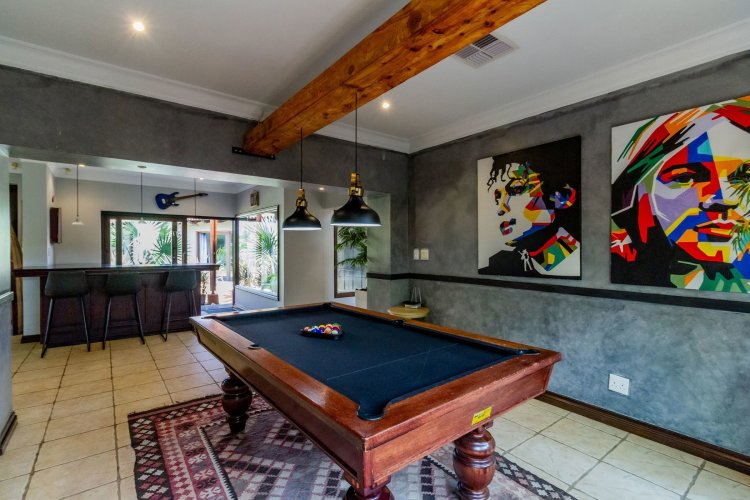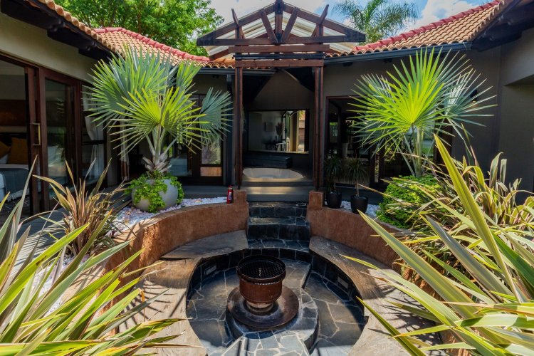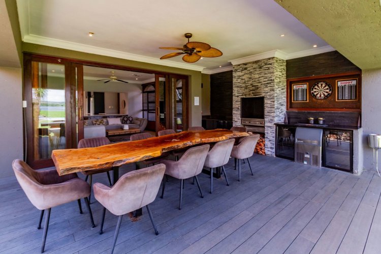 Outside, the covered patio has a gas braai and dartboard. Just around the corner is an inviting boma for winter nights, complete with a jacuzzi. Kids have plenty of grass to run around on and a splash pool to cool off in.