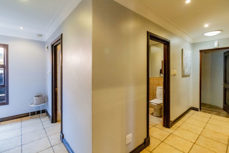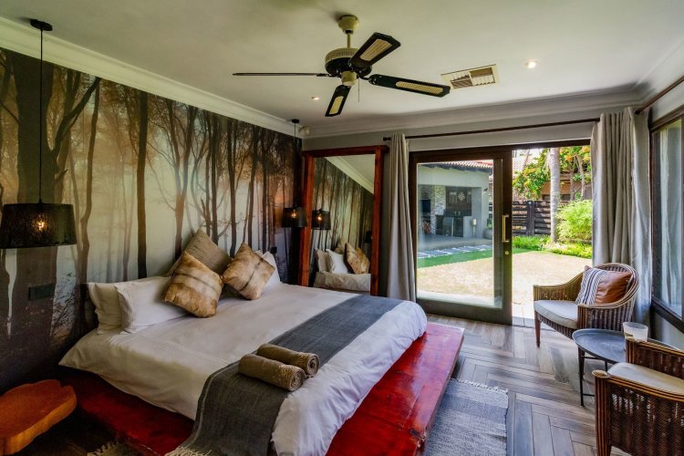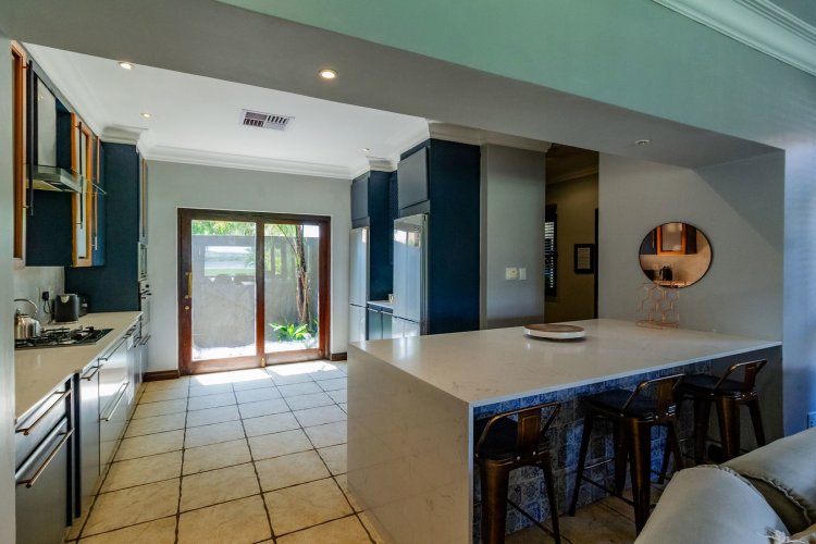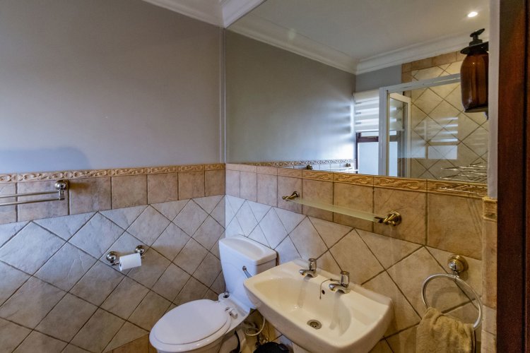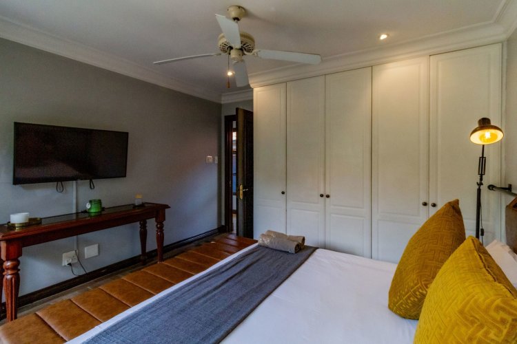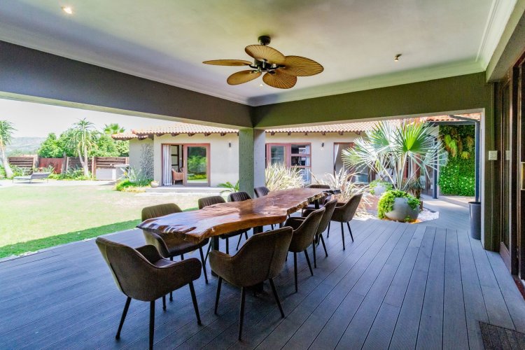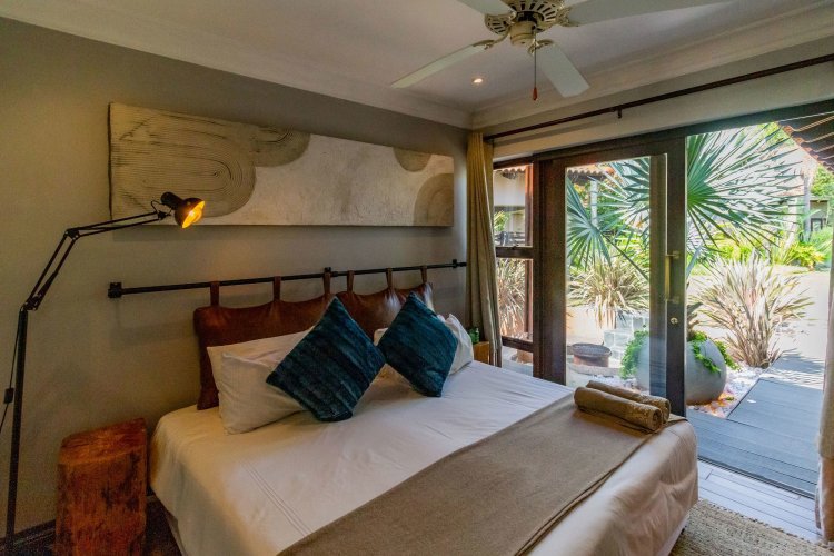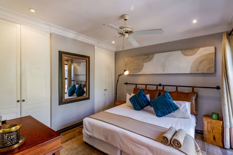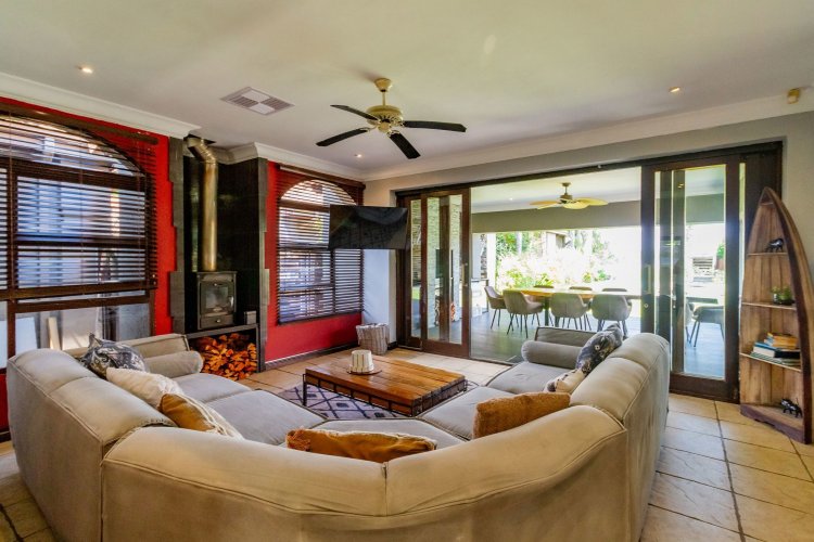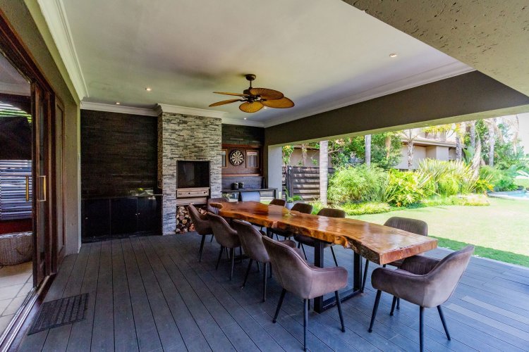 Outside, the covered patio has a gas braai and dartboard. Just around the corner is an inviting boma for winter nights, complete with a jacuzzi. Kids have plenty of grass to run around on and a splash pool to cool off in.