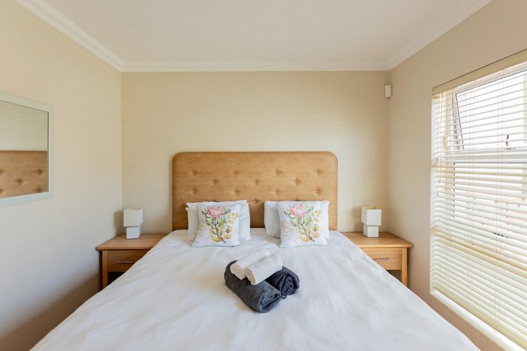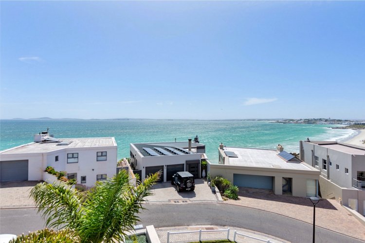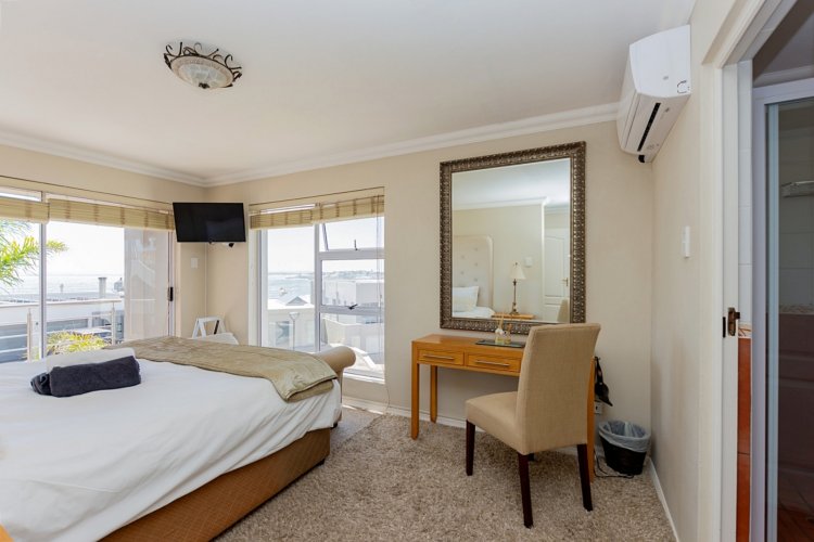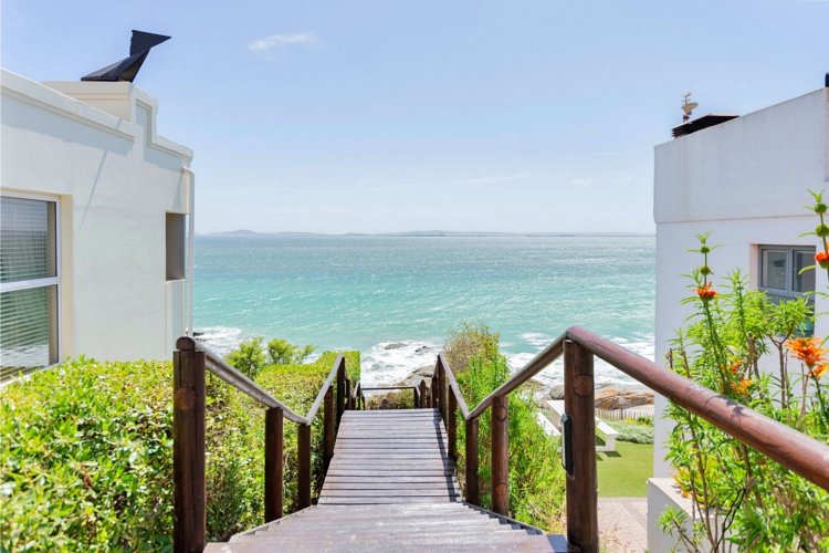 Designed for comfortable family living, the main residence spans two levels. The middle level features two spacious bedrooms, a full family bathroom, and a private study – perfect for working from home. Upstairs, the expansive open-plan living area includes a stylish lounge, dining space, and a fully fitted kitchen with separate scullery. The enclosed braai stoep is a true highlight, offering showstopping views across the bay. The master suite on this level boasts a walk-in closet and modern en-suite, while external stairs lead up to a rooftop terrace with panoramic sea views.