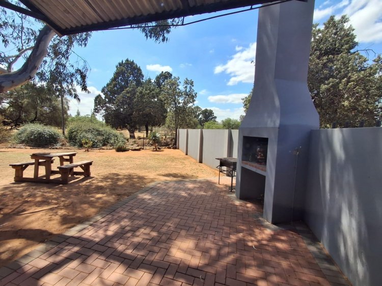 Outside, there is a neatly paved braai (barbecue) area, ideal for relaxing and entertaining. Parking is available for two vehicles under a carport.