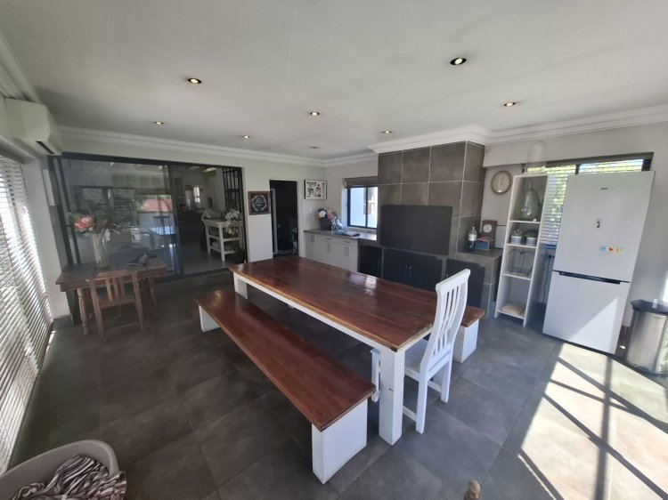 Adjacent is the entertainment area with a built-in braai, guest bathroom, and sliding doors connecting to the front yard. Big windows overlook the pool, filling the room with light.