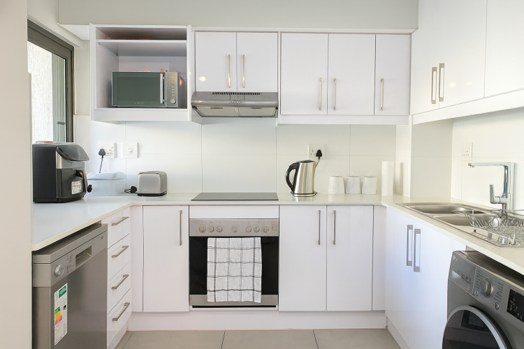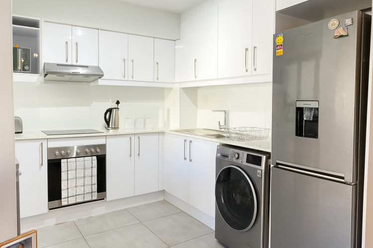 Fully fitted modern kitchen with built-in cupboards and quality appliances included (fridge, washer/dryer combo, and dishwasher)