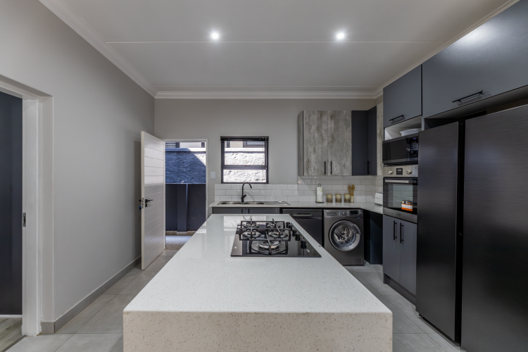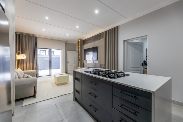 Step into a spacious open-plan layout flooded with natural light and finished with clean, modern lines. The sleek kitchen includes space for two appliances, an eye-level oven, double-door fridge space, and a central island fitted with a 5-burner gas hob, perfect for effortless cooking and entertaining.