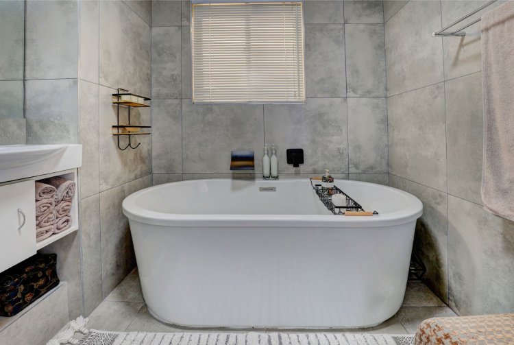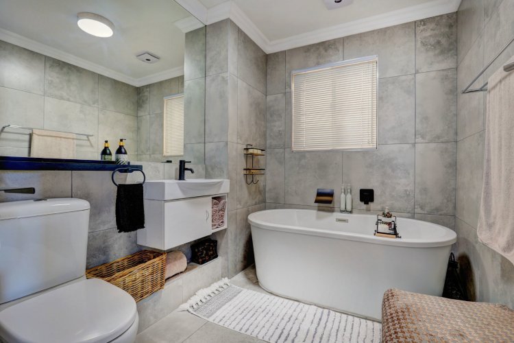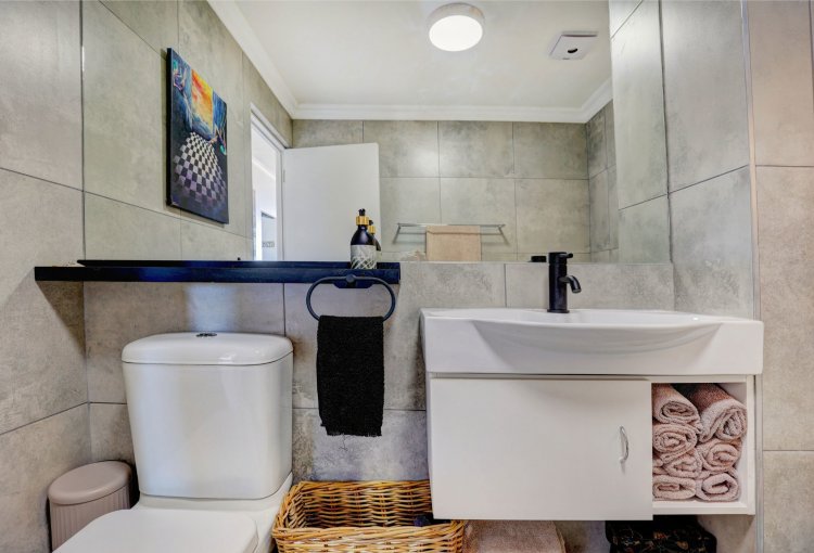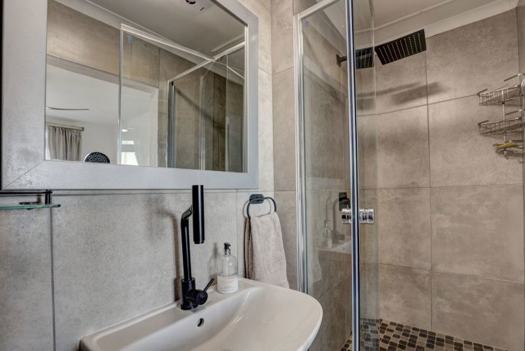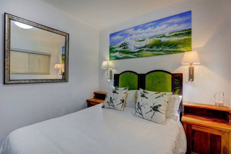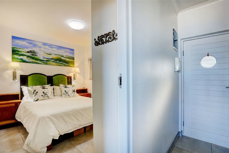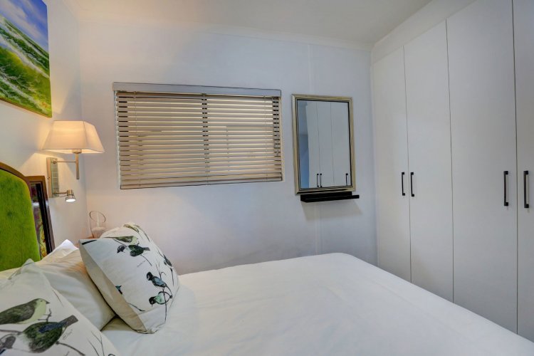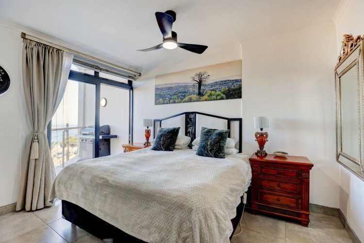 The main bedroom accommodates a king-size bed and includes an en-suite shower bathroom, tiled flooring, built-in cupboards, window blinds, and access to a small balcony with sea views. The second bedroom suits a queen-size bed and is serviced by a separate bathroom, also finished with tiled floors, built-in cupboards, and window blinds.