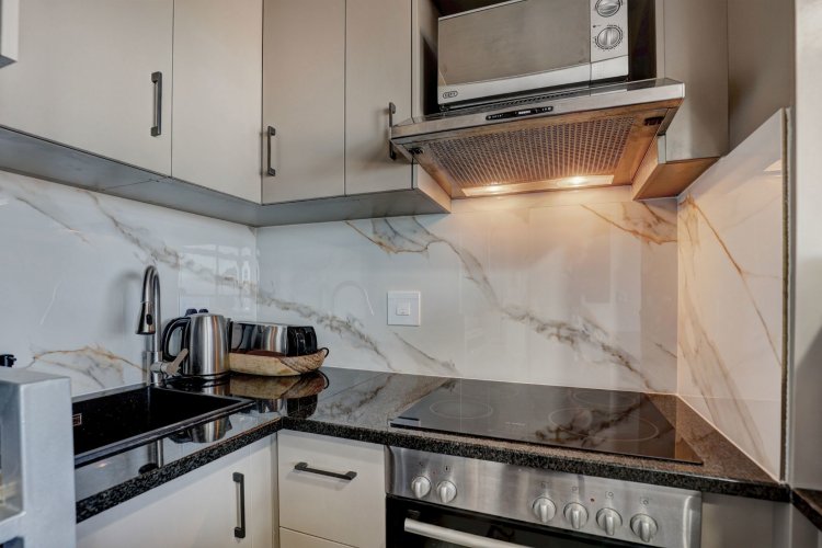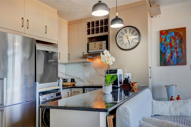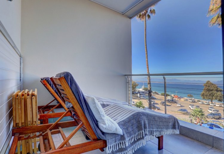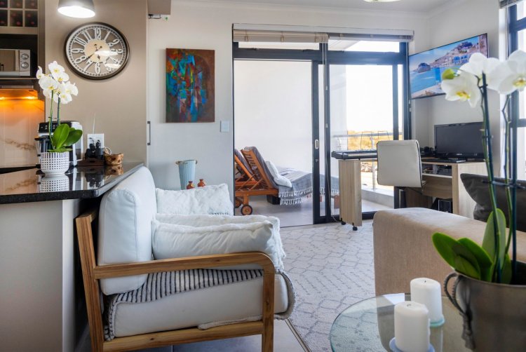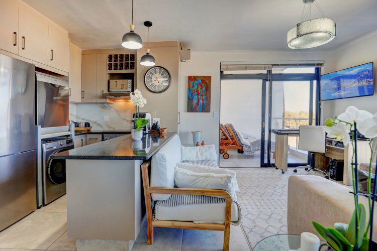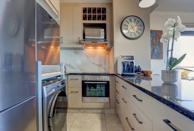 The open-plan lounge and kitchen form the main living space and are designed to maximize the views. The kitchen offers ample cupboard space and accommodates both a washing machine and a dishwasher, with granite countertops and tiled flooring. This area opens onto a second ocean-facing balcony, supporting easy everyday living and informal entertaining.