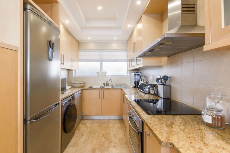 The modern kitchen, complete with appliances, flows seamlessly into the dining and lounge areas, which open onto the sea facing terrace. Both bedrooms are well appointed, with the main bedroom featuring an en-suite bathroom. The building offers 24 hour manned security, a communal swimming pool, refurbished foyer, and two new elevators. A lock up garage is included and accommodates a small to medium-sized vehicle. No pets permitted.