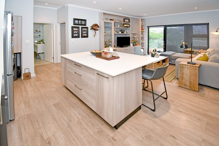 Measuring 76 square metres in extent. Open plan living/dining/ kitchen leads to a peaceful balcony offering treed views. Fully integrated kitchen with light wood cabinetry, stone tops and a gas hob with electric oven and an eat-at counter. The unit has been tastefully upgraded from its original modern finishes with extra cabinetry and integrated appliances in the kitchen.