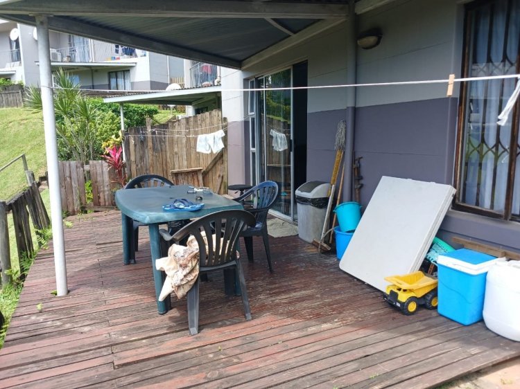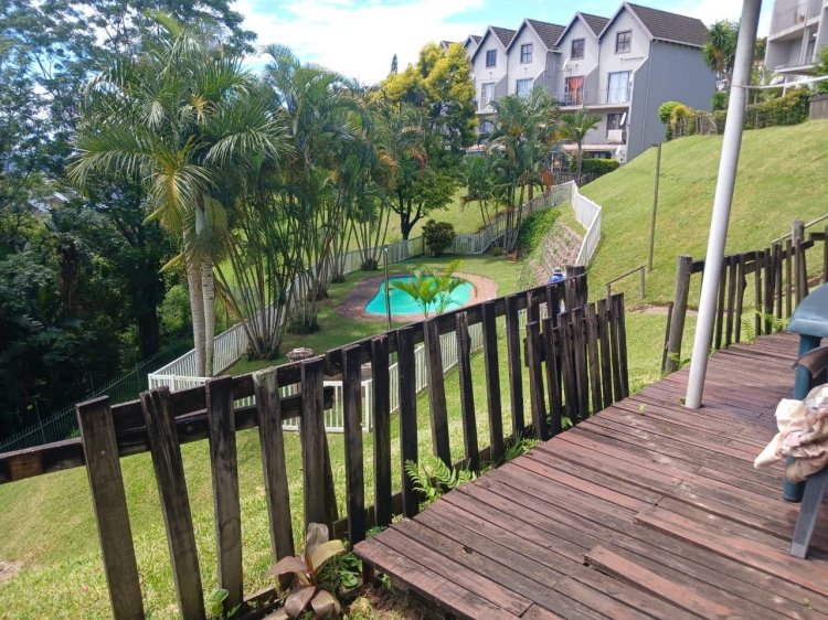 Step outside onto a partially covered wooden deck with a small garden, enclosed by a rustic picket fence overlooking the communal garden and swimming pool, ideal for relaxed outdoor living.