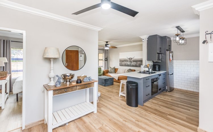Upon entry, you are welcomed into a spacious open-plan lounge, dining, and kitchen area. These modern living spaces are fitted with ceiling fans, stylish laminate flooring, aluminium windows with fitted blinds, and attractive ambient kitchen lighting that enhances the contemporary feel. The well-designed kitchen boasts modern cabinetry, a breakfast nook, quartz countertops, a gas hob, and space for a dishwasher, while the laundry area is conveniently located elsewhere.