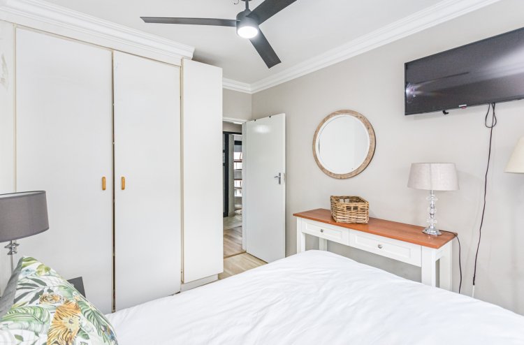 The property offers two generously sized bedrooms, both equipped with built-in cupboards and ceiling fans. The bathroom includes a shower and a separate, built-in space for a washing machine. Electricity is managed via a pre-paid meter, and the unit is fibre-ready for added convenience.