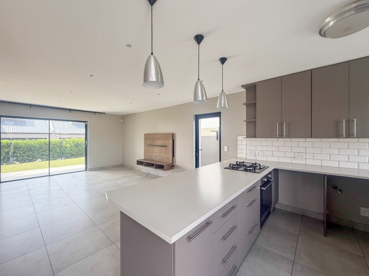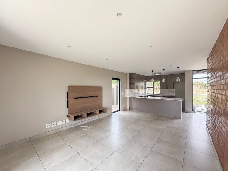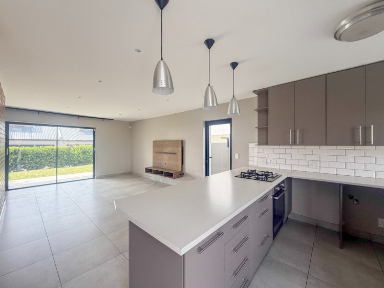 The ground floor features a spacious open-plan layout with a modern kitchen, dining area, and lounge that flow seamlessly together. Sliding doors open to a private garden and patio with a built-in braai — ideal for entertaining or enjoying quiet evenings at home.