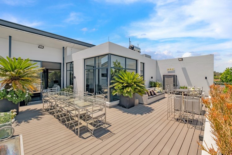 A sculptural glass spiral staircase ascends to the upper floor; an expansive entertainment level with a 2nd lounge, dining space, fitted bar, built-in gas braai, guest toilet and secondary kitchenette. The rooftop terrace stretches out to panoramic views across Johannesburg, framed by glass, air, and sky. A third en-suite bedroom provides serene seclusion for guests.